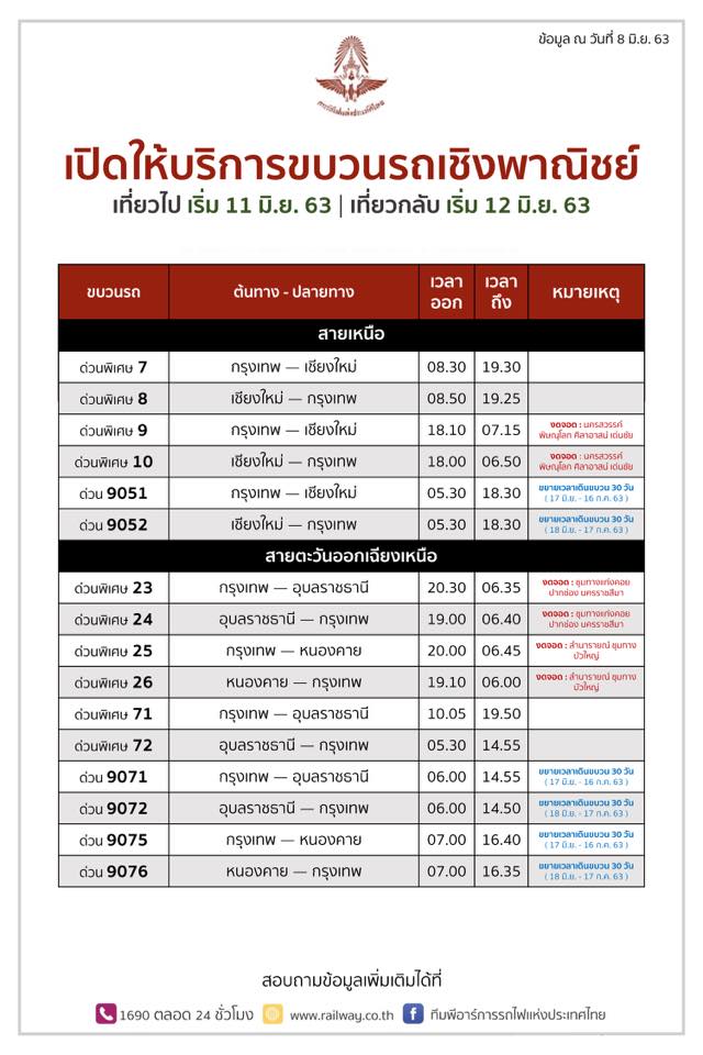 วันนี้ (11/6/63) หลังจากที่ศบค. มีมาตรการผ่อนคลายการเดินทางข้ามเขตพื้นที่จังหวัด เริ่มเปิดให้บริการวันนี้เป็นวันแรก นายนิรุฒ มณีพันธ์ ผู้ว่าการรถไฟแห่งประเทศไทย แจ้งว่า ตามที่ศูนย์บริหารสถานการณ์การแพร่ระบาดของโรคติดเชื้อไวรัสโคโรนา 2019 (โควิด-19) มีการผ่อนคลายการเดินทางข้ามเขตพื้นที่จังหวัด และให้ยานพาหนะ ผู้โดยสาร ตลอดจนผู้เกี่ยวข้องกับการขนส่งสาธารณะที่เป็นการขนส่งคนหรือสินค้าระหว่างจังหวัดที่เริ่มออกเดินทางจากจังหวัดต้นทาง ก่อนเวลา 23.00 น. และถึงจังหวัดปลายทางหลังเวลา 03.00 น. ของวันรุ่งขึ้น