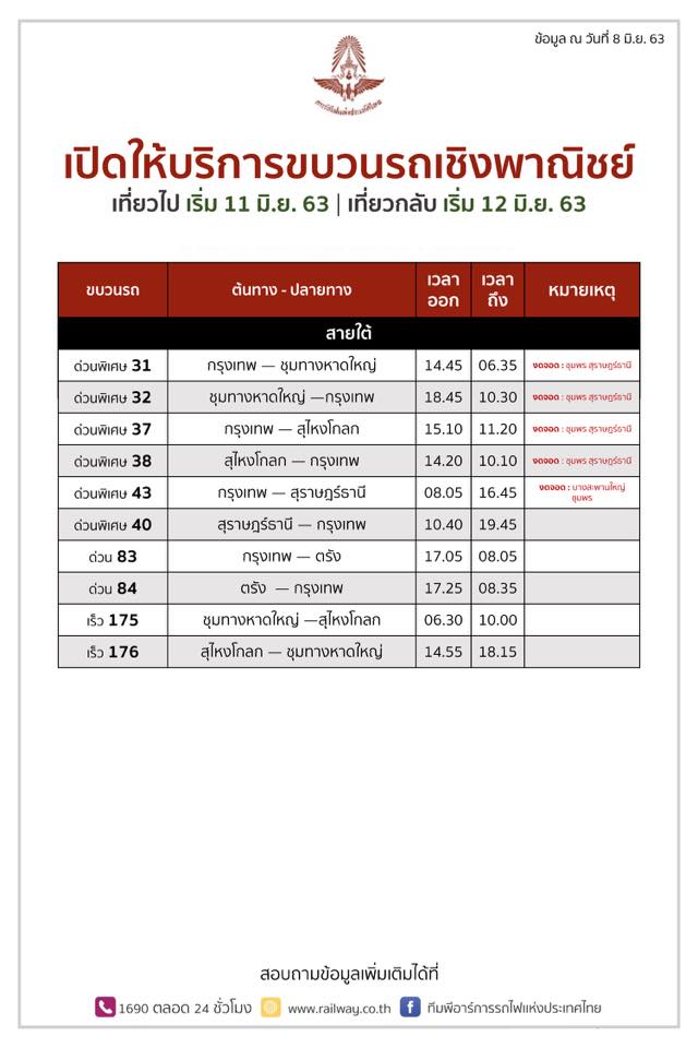 ตั้งแต่วันที่ 12 มิถุนายน 2563 (เที่ยวกลับ) จำนวน 5 ขบวน ประกอบด้วย ขบวนรถด่วนพิเศษที่ 32 (ชุมทางหาดใหญ่ - กรุงเทพ) ขบวนรถด่วนพิเศษที่ 38 (สุไหงโกลก - กรุงเทพ) และขบวนรถด่วนพิเศษ(ดีเซลราง)ที่ 40 (สุราษฎร์ธานี - กรุงเทพ) ขบวนรถด่วนที่ 84 (ตรัง - กรุงเทพ) และขบวนรถเร็วที่ 176 (สุไหงโก-ลก - ชุมทางหาดใหญ่) (**ขบวนรถที่ 32 และ 38 งดให้บริการรับ – ส่ง ผู้โดยสารที่ชุมพร และสุราษฎร์ธานี และขบวน 84 งดให้บริการรับ-ส่ง ผู้โดยสารที่ชุมพร และบางสะพานใหญ่ เนื่องจากยังอยู่ในช่วงเวลาเคอร์ฟิว**)