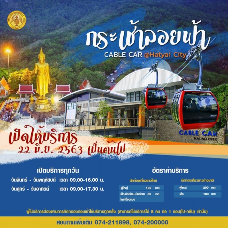 วันนี้ (19/6/63) หาดใหญ่โฟกัส ประชาสัมพันธ์ไปยังประชาชน เนื่องจาก กระเช้าลอยฟ้า HATYAI CABLE CAR เปิดให้บริการในวันจันทร์ที่ 22 มิถุนายน 2563 เป็นต้นไป โดยมีรายละเอียดดังนี้