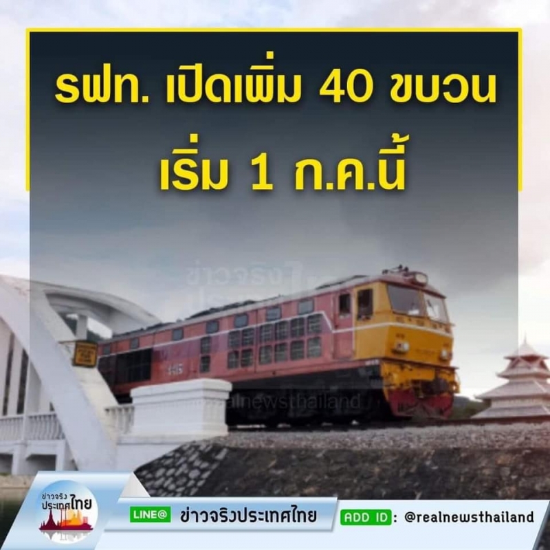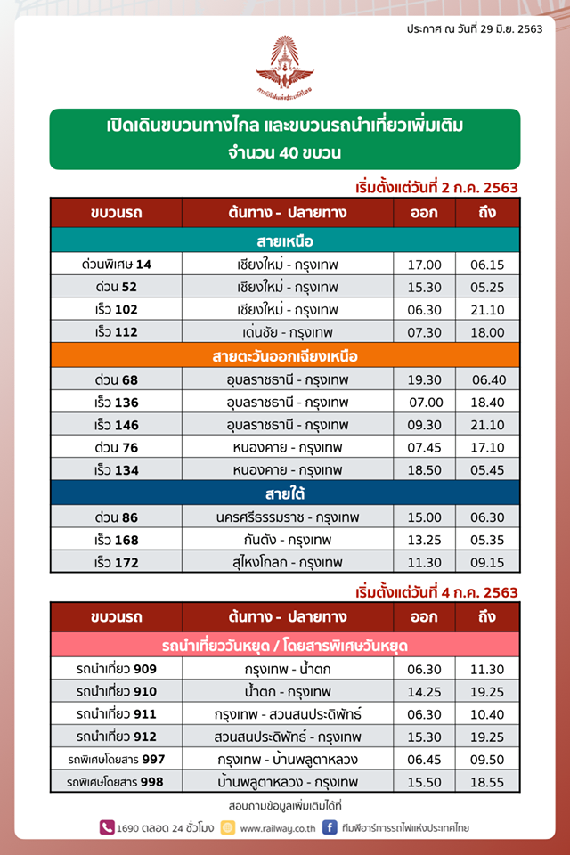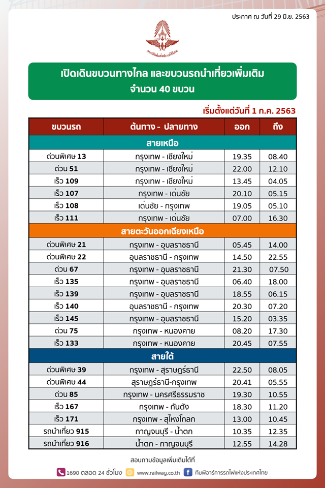 วันนี้(30/6/63) นายนิรุฒ มณีพันธ์ ผู้ว่าการรถไฟแห่งประเทศไทย หรือ รฟท. เปิดเผยว่า เพื่อเป็นการอำนวยความสะดวกการเดินทางของประชาชนที่มีความจำเป็นต้องเดินทางโดยรถไฟ ทั้งการเดินทางภายในเขตเมือง ระหว่างเมือง และทางไกล ข้ามเขตพื้นที่จังหวัด ตั้งแต่วันที่ 1 กรกฎาคมนี้เป็นต้นไป การรถไฟฯ ได้ประกาศเปิดเดินขบวนรถโดยสารทางไกลเพิ่มเติม อีกจำนวน 40 ขบวน ประกอบด้วย