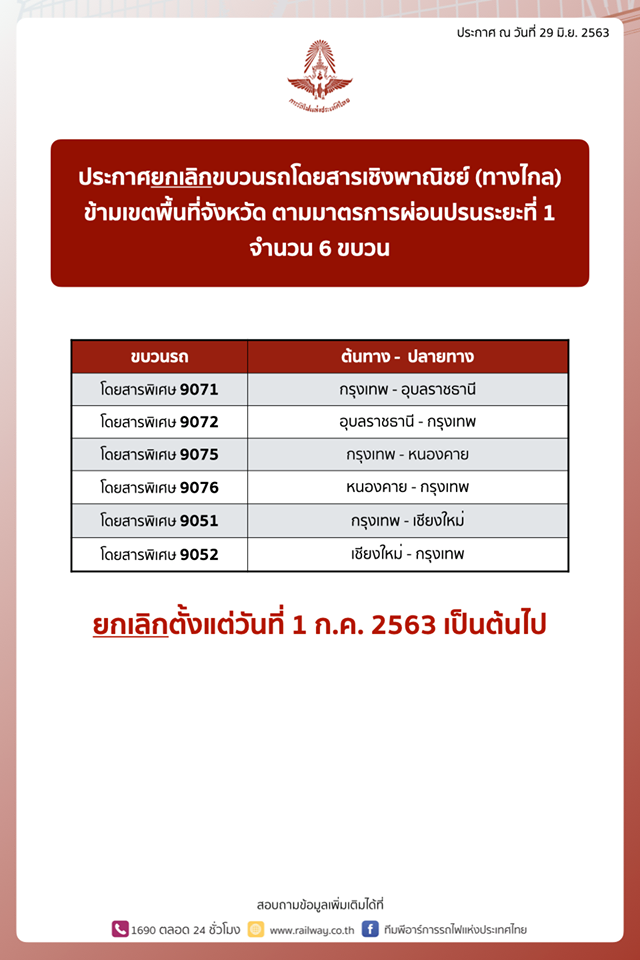 นอกจากนี้ ยังได้ประกาศยกเลิกขบวนรถโดยสารพิเศษที่ได้ขยายระยะเวลาให้บริการผู้ใช้บริการเป็นการชั่วคราว โดยจะประกาศยกเลิกตั้งแต่วันที่ 1 – 17 กรกฎาคม 2563 จำนวน 4 ขบวน ไป-กลับ ประกอบด้วย ขบวนรถโดยสารพิเศษที่ 9071 เส้นทาง กรุงเทพ–อุบลราชธานี / ขบวนรถโดยสารพิเศษ 9075 เส้นทาง กรุงเทพ–หนองคาย และขบวนรถโดยสารพิเศษ 9072 เส้นทาง อุบลราชธานี-กรุงเทพ ขบวนรถโดยสารพิเศษที่ 9076 เส้นทางหนองคาย-กรุงเทพ