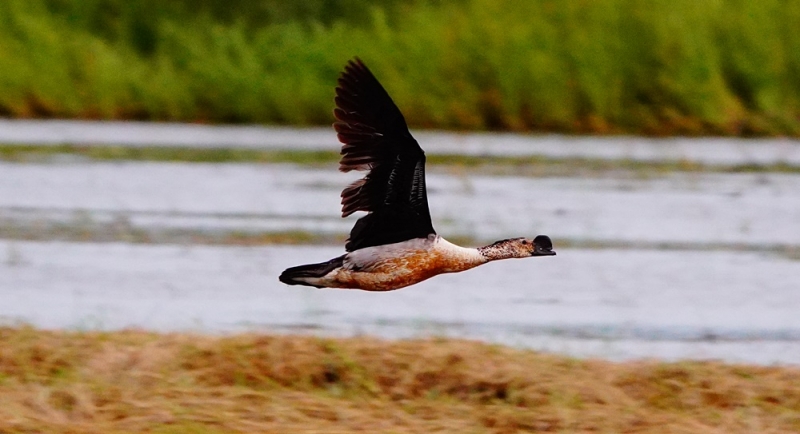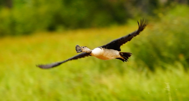 สำหรับนกเป็ดหงส์ จัดว่าเป็นเป็ดป่าขนาดใหญ่ชนิดหนึ่ง มีลำตัวประมาณ 76 เซนติเมตร มีจะงอยปากสีดำแถบบนปีกสีบรอนซ์สะดุดตา ตัวผู้มีส่วนหลังสีดำเหลือบสีเขียวแกมฟ้าและสีม่วง ส่วนหัวและลำคอสีขาว มีจุดประสีดำ แถบสีดำรอบด้านหลังคอพาดลงไปถึงด้านข้างของส่วนอก และอีกแถบหนึ่งพาดลงไปด้านข้างของส่วนหาง ขณะบินจะสังเกตเห็นแผ่นหลังส่วนล่างสีออกเทาชัดเจน ในฤดูผสมพันธุ์ตัวผู้มีปุ่มเนื้อที่โคนจะงอยปากด้านบนขยายใหญ่ขึ้นกว่าเดิมมาก จนเห็นได้ชัดเจน ขณะที่ตัวเมียมีขนาดเล็กกว่าและลำตัวสีทึมกว่า และไม่มีแถบสีดำสองแถบบนส่วนคอและที่ใกล้หาง ลูกอ่อนที่อายุน้อยลำตัวไม่ค่อยมีสีเหลือบและบริเวณแถบขาวมีสีคล้ำ