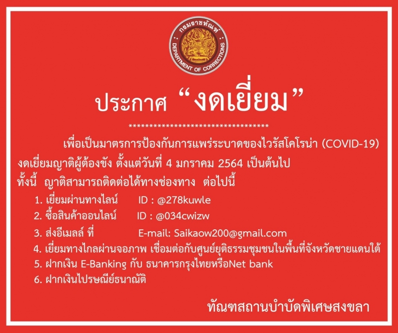 วันนี้ (5/1/64) ทัณฑสถานบำบัดพิเศษสงขลา ประกาศ “งดเยี่ยม” เพื่อเป็นมาตรการป้องกันการแพร่ระบาดของไวรัสโคโรน่า (COVID-19) งดเยี่ยมญาติผู้ต้องขังตั้งแต่วันที่ 5 มกราคม 2564 เป็นต้นไป
