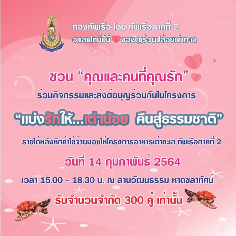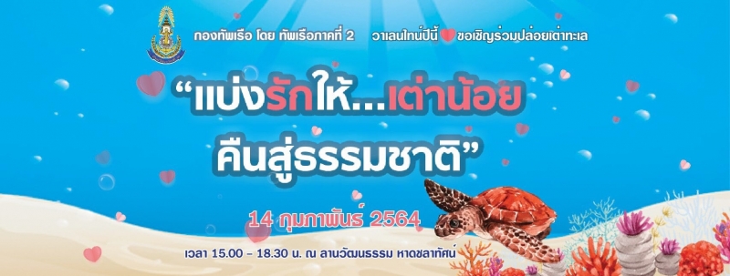 ทัพเรือภาคที่ 2 จึงได้กำหนดจัดกิจกรรม “โครงการแบ่งรักให้เต่าน้อย” ขึ้นบริเวณ ลานวัฒนธรรม ชายหาดชาดทัศน์ ใน วันที่ 14 กุมภาพันธ์ 2564 ตั้งแต่เวลา 15.00 -18.30 น. โดยจะปฏิบัติตามมาตรการเฝ้าระวังป้องกันและควบคุมโรคติดต่อเชื้อไวรัสโคโรนา2019 (COVID-19)