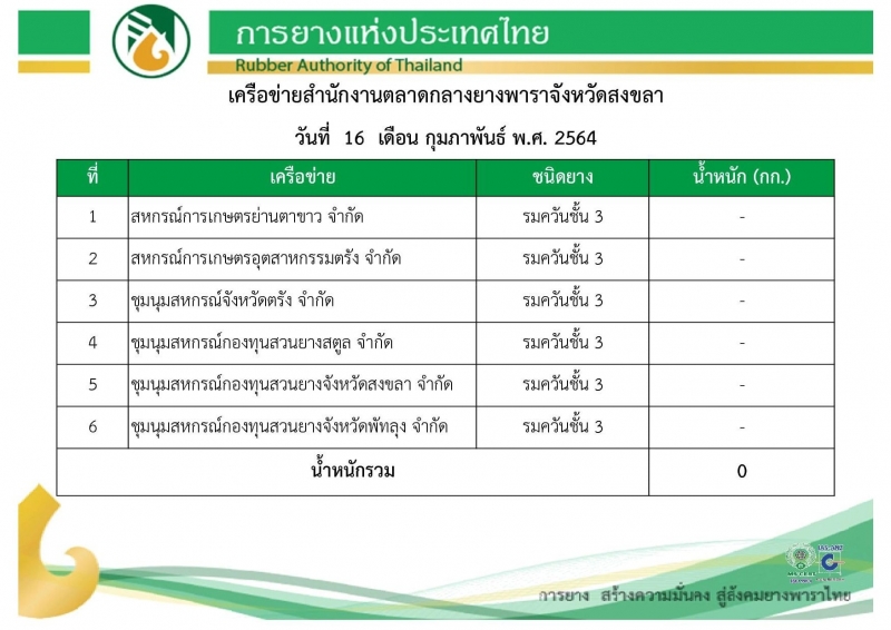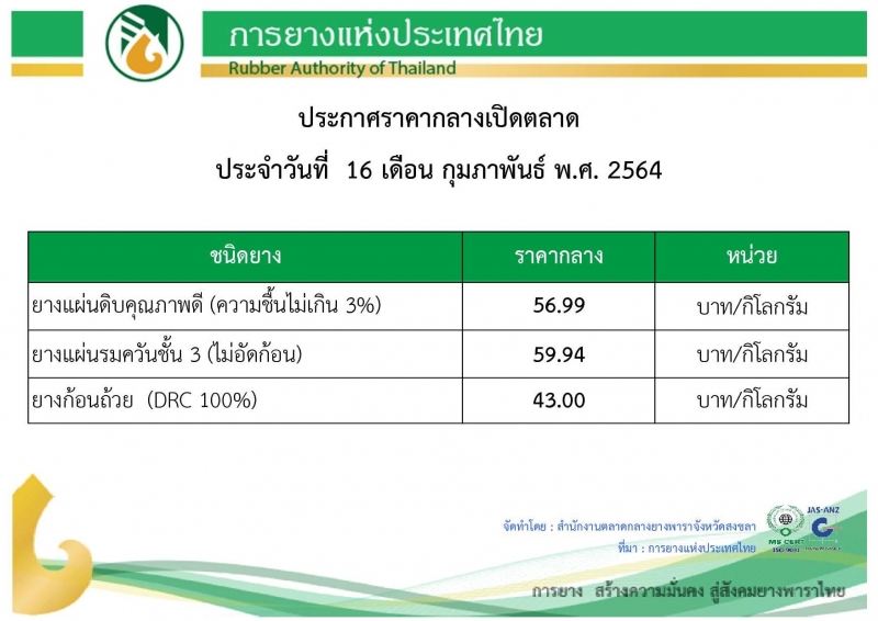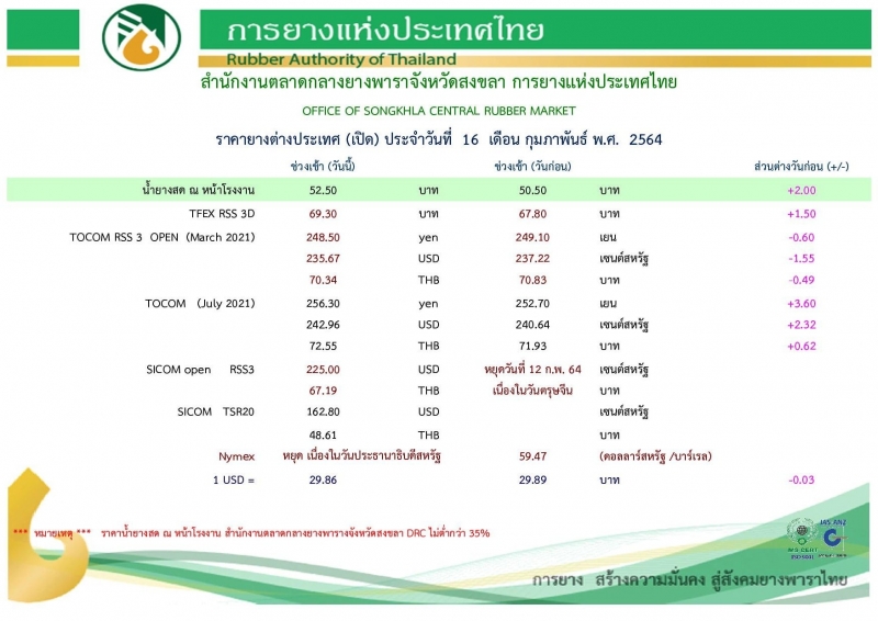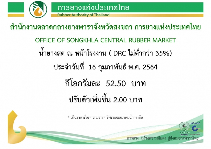 ล่าสุดวันนี้ (16/2/64) ราคาน้ำยางสด ปรับตัวเพิ่มขึ้น 2 บาท เป็น 52.50 บาท (น้ำยางสด ณ หน้าโรงงาน) ทางกยท. มีโครงการเพื่อช่วยเหลือเกษตรกรชาวสวนยาง ได้แก่ โครงการชะลอการขายยางของสถาบันเกษตรกร การเพิ่มจุดรับซื้อและรวบรวมน้ำยางสด และ โครงการประกันรายได้เกษตรกรชาวสวนยาง ระยะ 2 เพื่อลดความเสี่ยงด้านรายได้