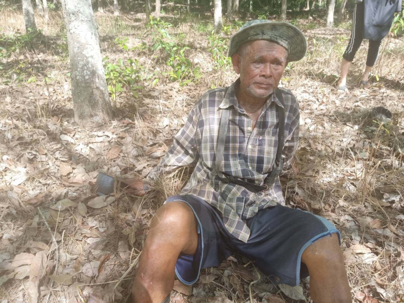 อยู่บ้านเลขที่ 140 หมู่ 3 ต.พนมวังค์ .อ.ควนขนุน จ.พัทลุง กำลังนั่งหมดแรง ใกล้จุดที่ไฟไหม้ ซึ่งเจ้าหน้าที่พร้อมชาวบ้านเร่งระดมฉีดน้ำก่อนสกัดไฟไม่ให้ลุกลามได้หลังไฟดับพบพื้นที่สวนยางพาราถูกไฟไหม้ได้รับความเสียหายกว่า 7 ไร่