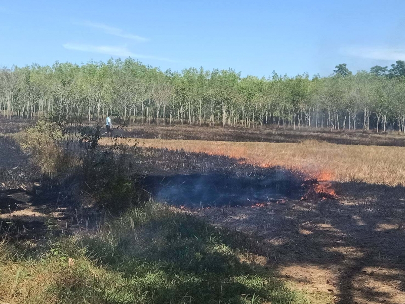 จากการสอบถามลุง เชย จันทร์สว่าง อายุ69ปี กล่าว่า ก่อนเกิดเหตุตนเองได้เผาตอซังในพื้นที่นาเพื่อจะเตรียมทำนาปรังของฤดูการที่จะมาถึง ขณะที่ไฟไหม้ตอซังลมได้พัดแรงบวกกับจังหวะอากาศร้อนทำให้ลุกลามไหม้สวนยางพารา ของเพื่อนบ้านแม้ตนจะพยามยามดับไฟแต่ก็เอาไม่อยู่จนเพลิงได้ไหม้ลุกลามเป็นบริเวณกว้างก่อนพลเมืองดีเห็นแจ้งรถดับเพลิงช่วยสกัดดังกล่าว