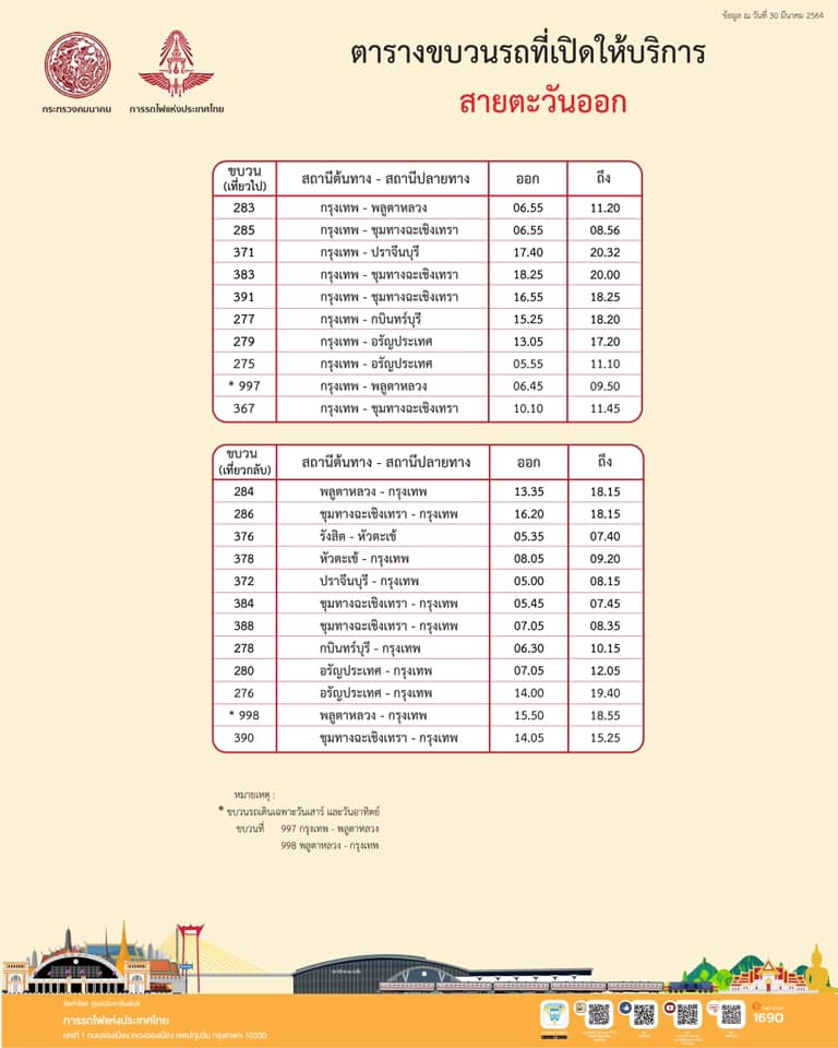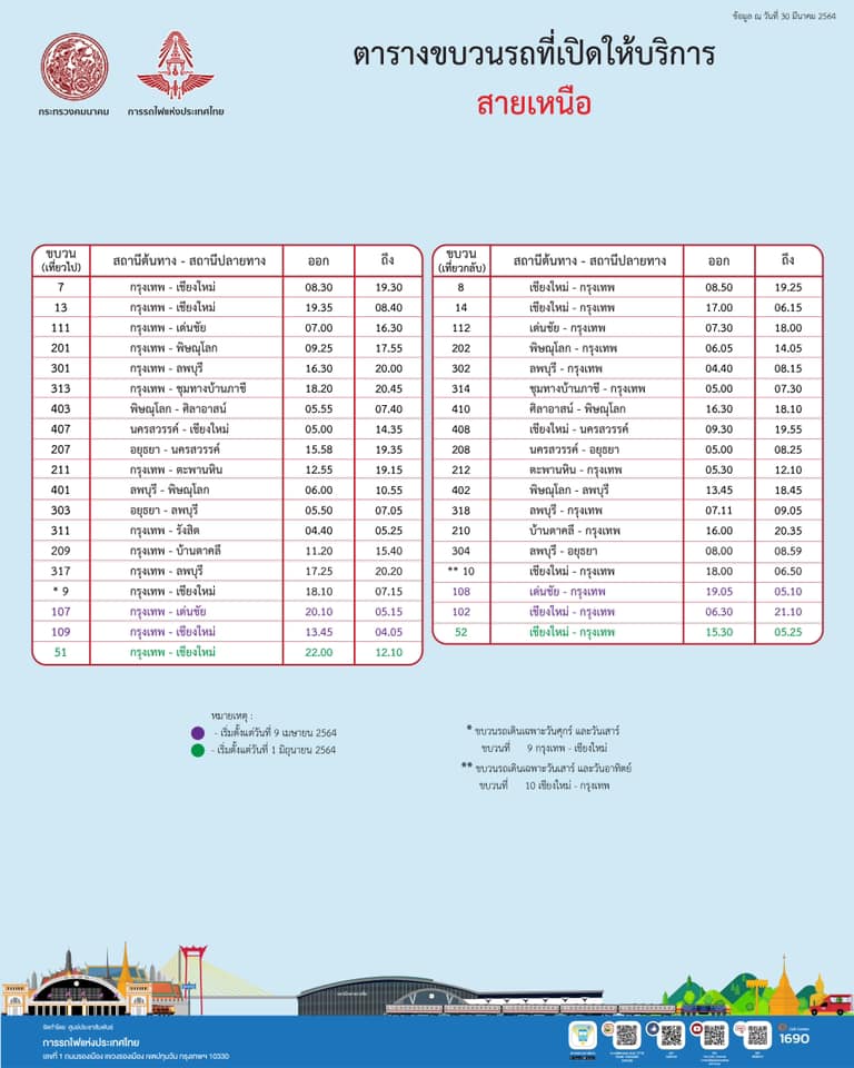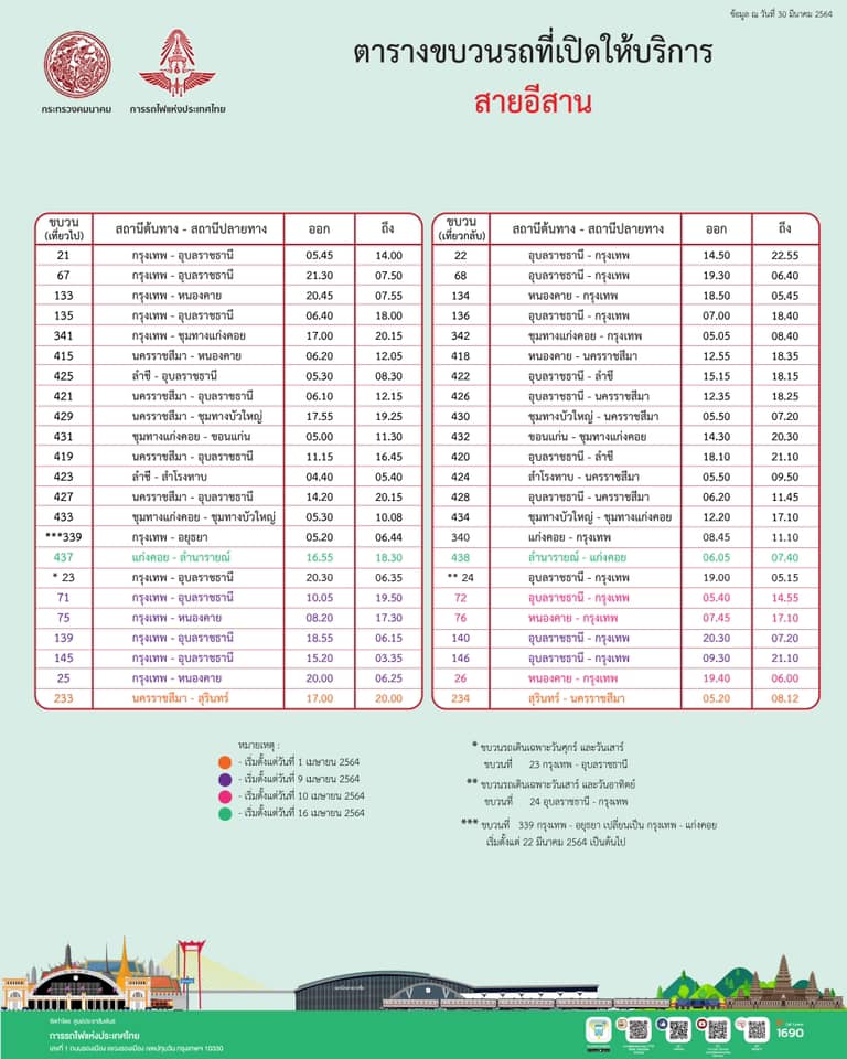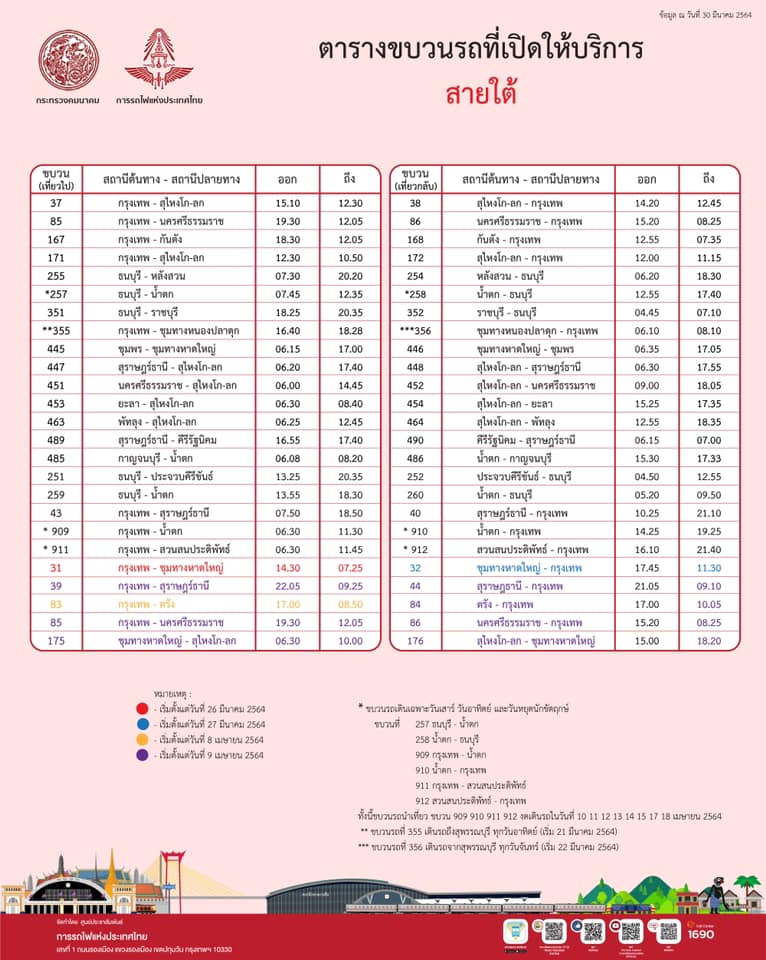 วันนี้(31/3/64) Update!! ล่าสุด ตารางขบวนรถไฟทุกสาย ในช่วงการแพร่ระบาดของ COVID-19 เพื่อความสะดวกสบายของประชาชน ได้ทราบเวลาในการเดินรถ และเวลาที่ตัวรถเคลื่อนตัวออกแต่ละสถานีในช่วงของการแพร่ระบาดโควิด-19 ระลอกใหม่ ดังนี้