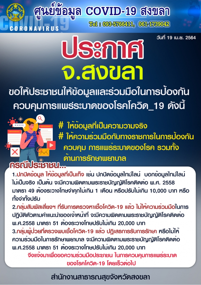 วันนี้(20/4/64) จังหวัดสงขลาขอให้ประชาชนให้ข้อมูล และร่วมมือในการป้องกันและควบคุมการแพร่ระบาดของโควิด- 19 ดังนี้ ให้ข้อมูลที่เป็นจริง ให้ความร่วมมือกับทางราชการในการป้องกันควบคุม การแพร่ระบาดของโรค รวมทั้งการรักษาพยาบาล