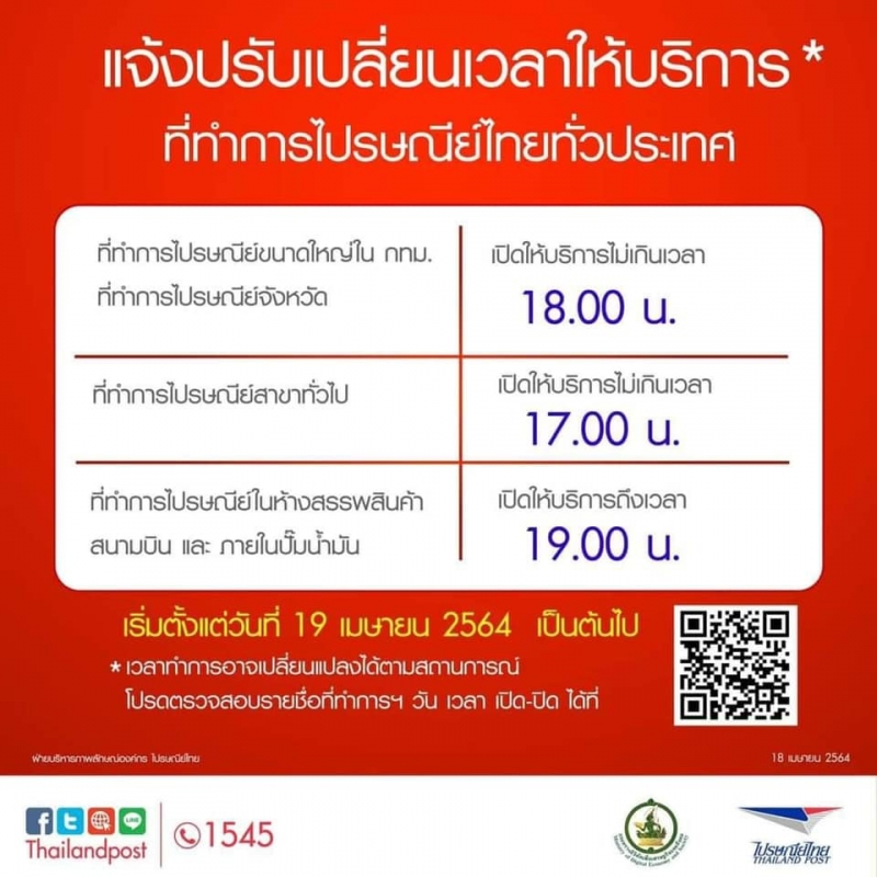 ขณะที่ ไปรษณีย์ไทย เป็นอีกหนึ่งสถานที่ ในการรวมตัวของประชาชนเพื่อใช้บริการส่งพัสดุ ล่าสุด ไปรษณีย์ไทย ปรับเปลี่ยนเวลาเปิด-ปิดสาขาทั่วประเทศ ดังนี้