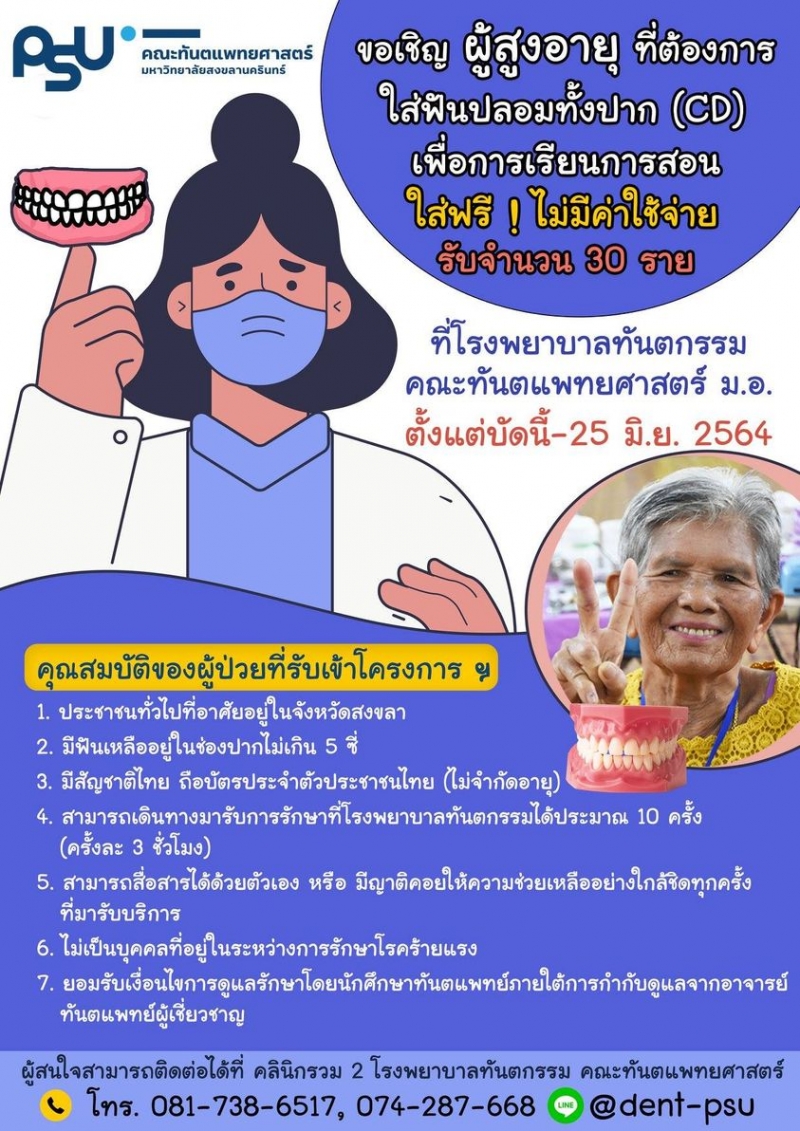 วันนี้(8/6/64) หาดใหญ่โฟกัส มีข่าวมาประชาสัมพันธ์ขอเชิญผู้สูงอายุที่ต้องการใส่ฟันปลอมทั้งปาก (CD) เพื่อการเรียนการสอน ฟรี! ไม่มีค่าใช้จ่าย ที่โรงพยาบาลทันตกรรม คณะทันตแพทยศาสตร์ มหาวิทยาลัยสงขลานครินทร์ รับสมัครตั้งแต่บัดนี้- 25 มิถุนายน 2564 รับจำนวนจำกัดเพียง 30 คน