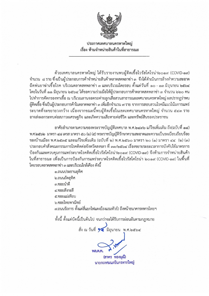 รวบรวมคำสั่งคณะกรรมการโรคติดต่อจังหวัดสงขลา ฉบับที่ 33/2564 เรื่อง การขยายระยะเวลาการบังคับใช้การป้องกันและควบคุม พ.ศ. 2562 โรคติดเชื้อไวรัสโคโรนา (COVID-19) ห้ามขายสินค้าในที่สาธารณะ เพื่อป้องกันการแพร่กระจายของโรคติดเชื้อไวรัส โคโรน่า 2019 (COVID-19) บริเวณรอบตลาดสดพลาซ่า 3 และพื้นที่ใกล้เคียงดังนี้