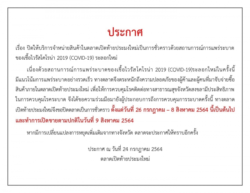 ทางตลาดเปิดท้ายประมงใหม่จึงขอปิดตลาดเป็นการชั่วคราวตั้งแต่วันที่ 26 กรกฎาคม – 8 สิงหาคม 2564 เป็นต้นไป และทำการเปิดขายตามปกติในวันที่ 9 สิงหาคม 2564 หากมีการเปลี่ยนแปลงการหยุดเพิ่มเติมจากทางจังหวัดตลาดจะประกาศให้ทราบอีกครั้ง