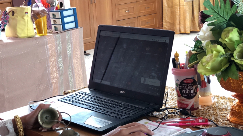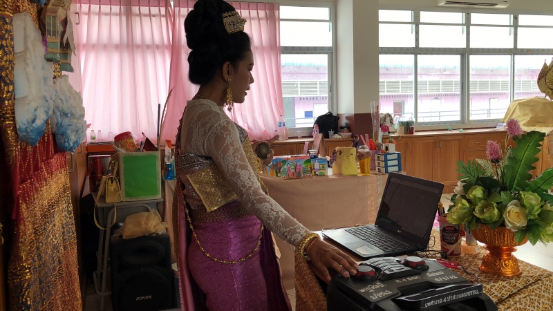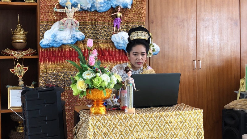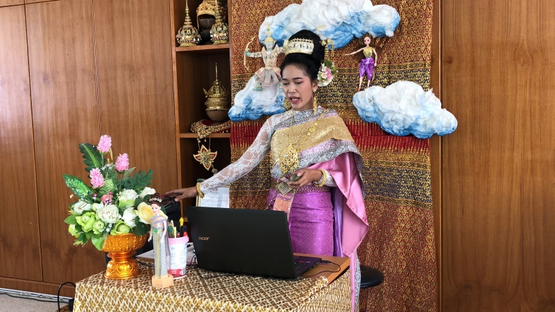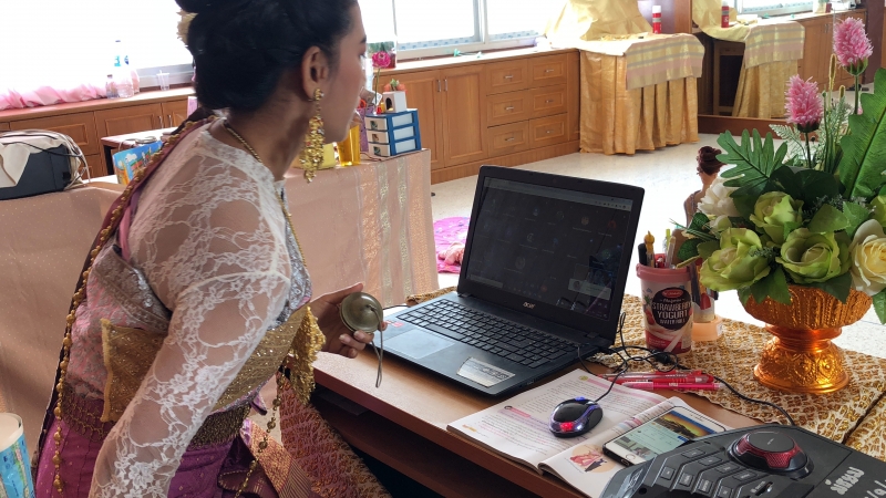 ล่าสุดบรรยากาศภายในห้องเรียนวิชานาฏศิลป์โรงเรียนเทศบาล 4 (บ้านแหลมทราย) ซอยราชดำเนิน ตำบลบ่อยาง อำเภอเมือง จังหวัดสงขลา ภาพคุณครูจีราวรรณ ชาวสวน อายุ 36 ปี ครูสอนประจำวิชานาฏศิลป์ ซึ่งกำลังวุ่นอยู่กับการแต่งตัวนำชุดไทยมาสวมใส่ เพื่อเพิ่มสีสันในชั่วโมงการสอนวิชานาฏศิลป์ผ่านระบบออนไลน์ โดยใช้โปรแกรมซูม หรือ ZOOM กับนักเรียนชั้นมัธยมศึกษาปีที่ 2 ซึ่งในวันนี้คุณครูจีราวรรณได้เลือกแต่งชุดไทยจักรีซึ่งตรงกับเนื้อหาวิชาที่สอน