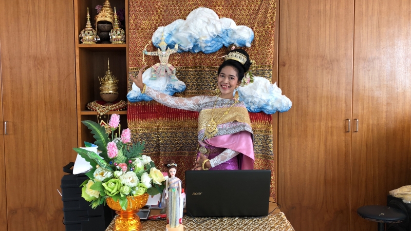 หลังคุณครูจีราวรรณแต่งตัวเสร็จ ก็ได้เดินไปที่โต๊ะสอนหนังสือพร้อมกับเปิดโปรแกรมเพื่อทำการสอน โดยบริเวณรอบๆโต๊ะและฉากพื้นหลังได้ถูกตกแต่งเป็นเรื่องราวโดยมีตัวละครทศกัณฑ์และชาวบ้านกำลังยืนอยู่บนก้อนเมฆ พร้อมเครื่องประดับการแสดงนาฏศิลป์ตกแต่งไว้อย่างสวยงาม เมื่อถึงเวลาสอนคุณครูจีราวรรณก็ได้วาดลวดลายการสอนอย่างอารมดีและยังมีอุปกรณ์การสอนต่างๆ แม้กระทั้งฉิ่งได้ถูกนำมาใช้ในการเปิดตัวและทำเสียงต่างๆควบคู่กับการสอนไปด้วย