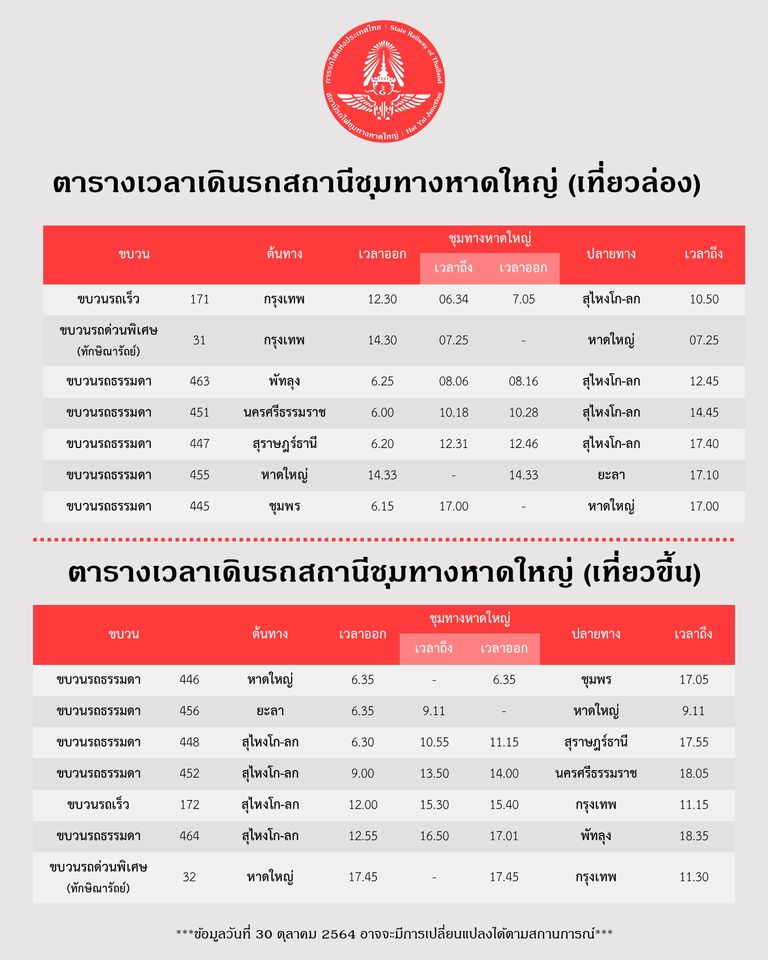 ***ข้อมูลอัพเดทวันที่ 30 ตุลาคม 2564*** ทางสถานีชุมทางหาดใหญ่ในนามของการรถไฟแห่งประเทศไทยขออภัยในความไม่สะดวกมา ณ โอกาศนี้