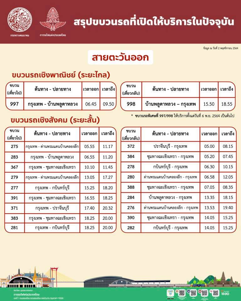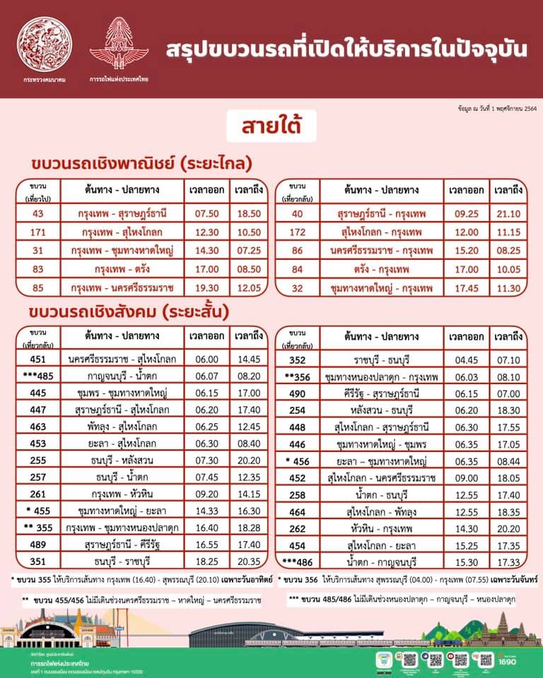 วันนี้ (2/11/64) นายนิรุฒ มณีพันธ์ ผู้ว่าการรถไฟแห่งประเทศไทย เปิดเผยว่า ตามที่ศูนย์บริหารสถานการณ์แพร่ระบาดของโรคติดเชื้อไวรัสโคโรนา 2019 (ศบค.)ได้มีมาตรการผ่อนคลายการเดินทาง และยกเลิกมาตรการห้ามออกนอกเคหสถาน (เคอร์ฟิว) ทุกจังหวัด ยกเว้นพื้นที่ควบคุมสูงสุดและเข้มงวด (สีแดงเข้ม) 7 จังหวัด การรถไฟฯ จึงได้ปรับการเดินขบวนรถให้สอดคล้องกับสภาพการเดินทางและรองรับนโยบายการเปิดประเทศของรัฐบาล โดยเพิ่มการให้บริการขบวนรถเชิงพาณิชย์ และขบวนรถเชิงสังคมจำนวน 46 ขบวน ได้แก่ เส้นทางสายเหนือ 10 ขบวน สายตะวันออกเฉียงเหนือ 16 ขบวน สายใต้ 6 ขบวน สายตะวันออก 4 ขบวน และสายวงเวียนใหญ่-มหาชัย 10 ขบวน รวมทั้งปรับเปลี่ยนสถานีต้นทางปลายทางในบางขบวนใหม่ เพื่ออำนวยความสะดวกการเดินทางแก่ประชาชน นักเรียน นักศึกษาและนักท่องเที่ยว เริ่มตั้งแต่วันที่ 1 พฤศจิกายน 2564 เป็นต้นไป โดยมีขบวนรถที่ให้บริการในเส้นทางต่าง ๆ ดังนี้