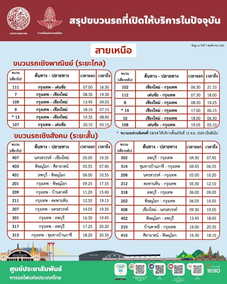 - ขบวนรถด่วนพิเศษที่ 13/14 กรุงเทพ - เชียงใหม่ - กรุงเทพ (เริ่มให้บริการตั้งแต่วันที่ 12 พฤศจิกายน 2564)