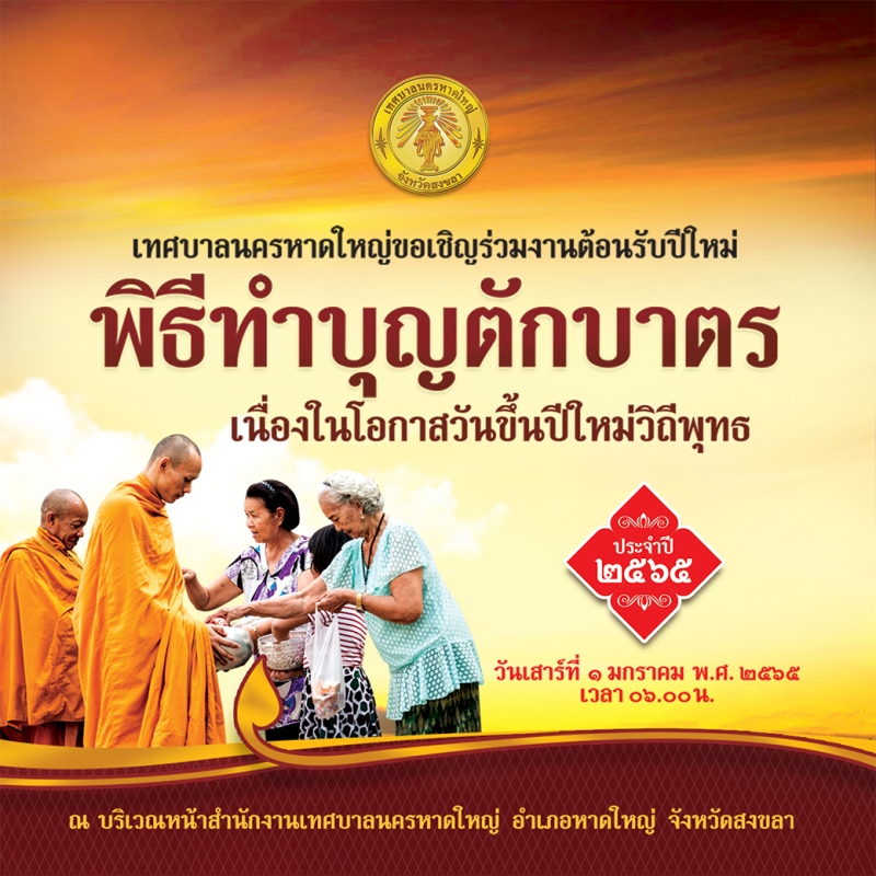 เทศบาลนครหาดใหญ่ขอเชิญร่วมงานต้อนรับปีใหม่พิธีทำบุญตักบาตรเนื่องในโอกาสวันขึ้นปีใหม่วิถีพุทธ ประจำปี 2565 วันเสาร์ที่ 1 มกราคม 2565 เวลา 06.00-08.30 น. ณ บริเวณหน้าสำนักงานเทศบาลนครหาดใหญ่ อ.หาดใหญ่ จ.สงขลา