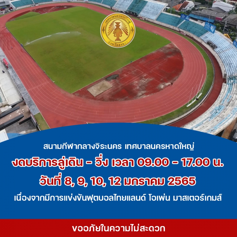 วันนี้ (8/1/65) สนามกีฬากลางจิระนคร เทศบาลนครหาดใหญ่ งดบริการลู่เดิน - วิ่ง เวลา 09.00 - 17.00 น. วันที่ 8, 9, 10, 12 มกราคม 2565 เนื่องจากมีการแข่งขันฟุตบอลไทยแลนด์ โอเพ่น มาสเตอร์เกมส์