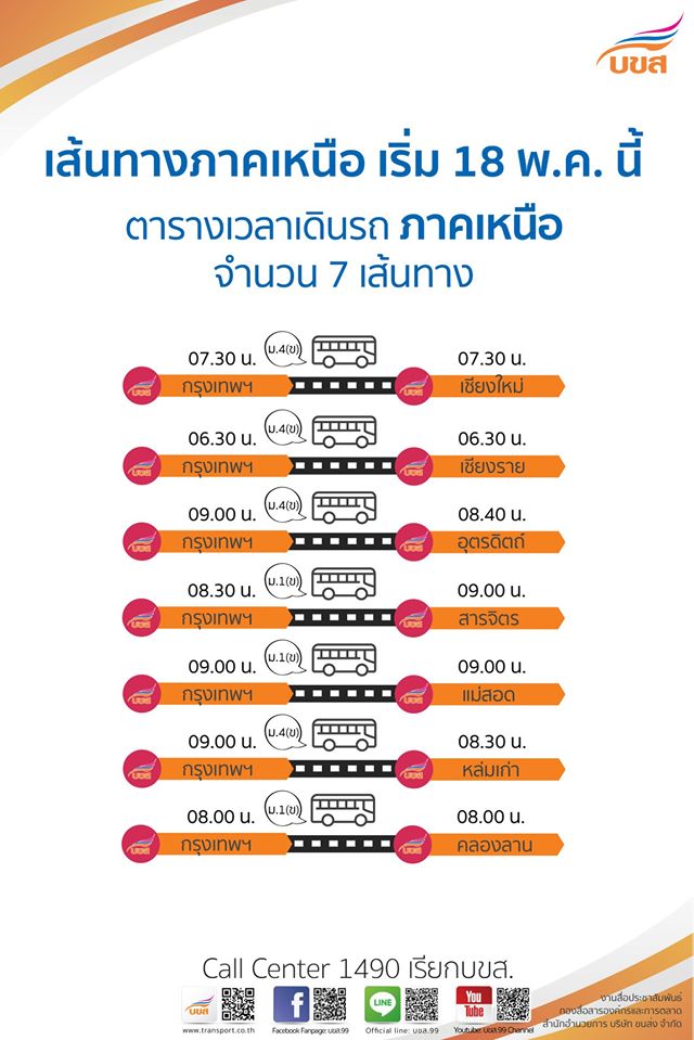 นายสัญลักข์ ปัญวัฒนลิขิต กรรมการผู้จัดการใหญ่ บริษัท ขนส่ง จำกัด (บขส.) เปิดเผยว่า บขส. ได้ปรับตารางการเดินรถใหม่ เริ่มตั้งแต่วันที่ 1 พฤษภาคม 2565 เป็นต้นไป เพื่อให้สอดคล้องกับนโยบายของรัฐบาลที่ได้มีมาตรการผ่อนคลายในการเดินทางเข้าราชอาณาจักร ตั้งแต่วันที่ 1 พฤษภาคม 2565 รวมทั้งเพื่อเตรียมความพร้อมในการอำนวยความสะดวกและรองรับการเดินทางของประชาชน โดยเส้นทางภาคเหนือ จะเปิดให้บริการ 14 เส้นทาง อาทิ