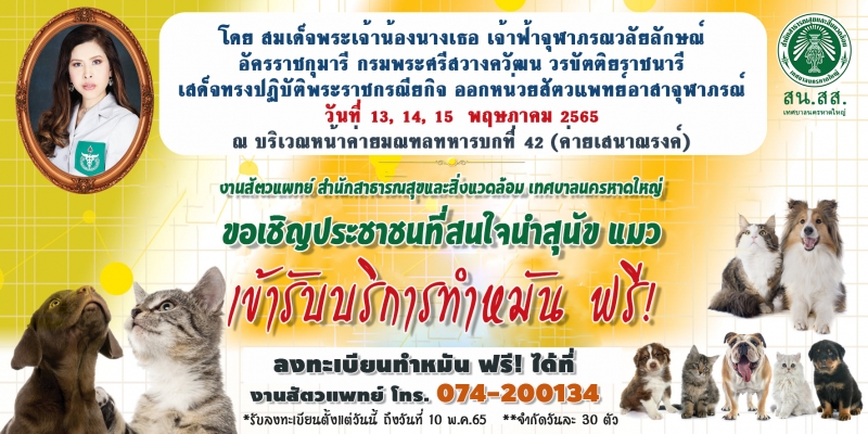 ประชาสัมพันธ์ งานสัตวแพทย์ สน.สส. เทศบาลนครหาดใหญ่ : ทำหมันสุนัข แมว ฟรี! โดย สมเด็จพระเจ้าน้องนางเธอ เจ้าฟ้าจุฬาภรณวลัยลักษณ์ อัครราชกุมารี กรมพระศรีสวางควัฒน วรขัตติยราชนารี เสด็จทรงปฏิบัติพระราชกรณียกิจ ออกหน่วยสัตวแพทย์อาสาจุฬาภรณ์ วันที่ 13, 14, 15 พฤษภาคม 2565 ณ บริเวณหน้าค่ายมณฑลทหารบกที่ 42 (ค่ายเสนาณรงค์)