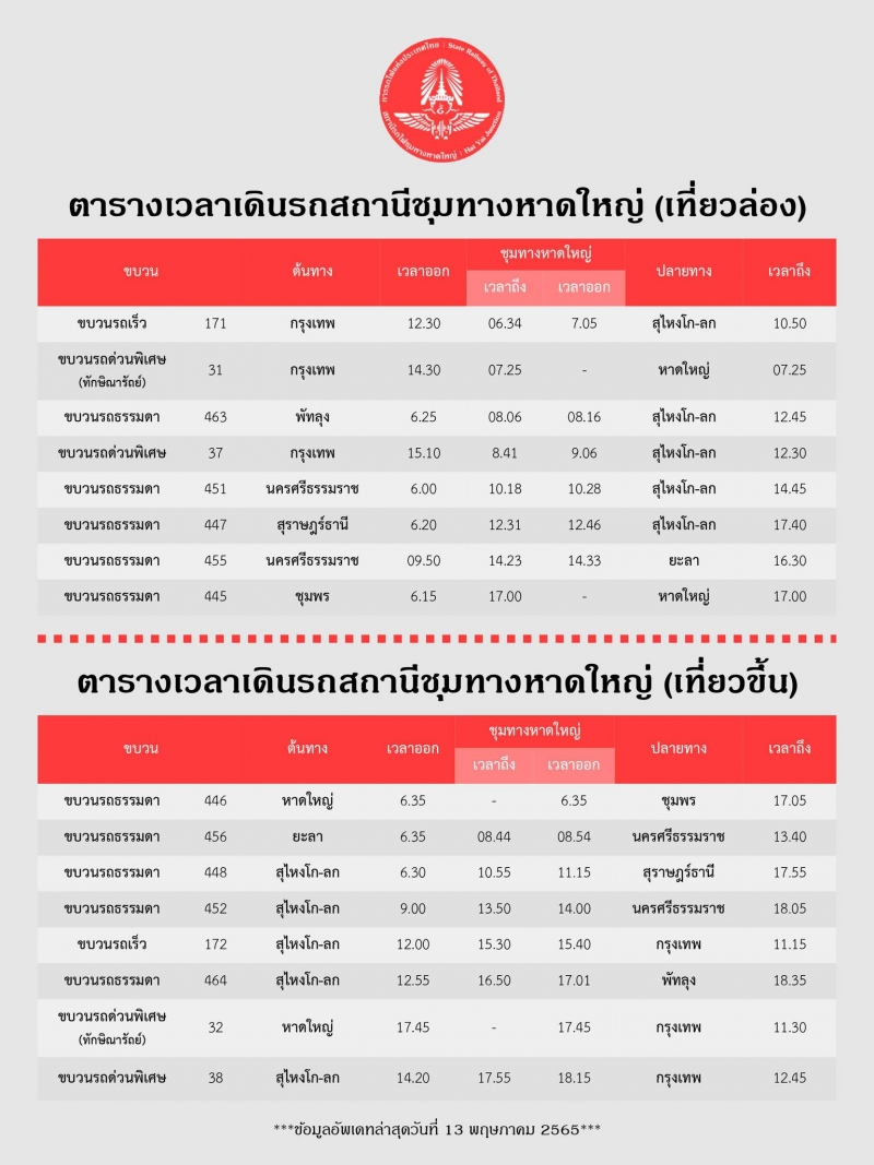 ประกาศการรถไฟแห่งประเทศไทย การให้บริการรถไฟโดยสารสถานีรถไฟชุมทางหาดใหญ่ ในช่วงสถานการณ์การแพร่ระบาดของเชื้อไวรัสโคโรน่า(COVID-19) โดยมีขบวนให้บริการดังนี้