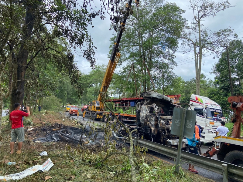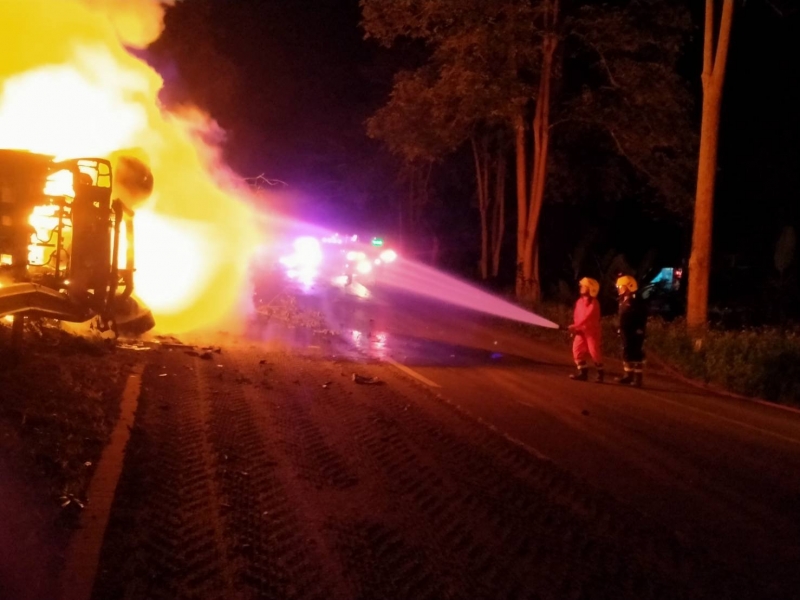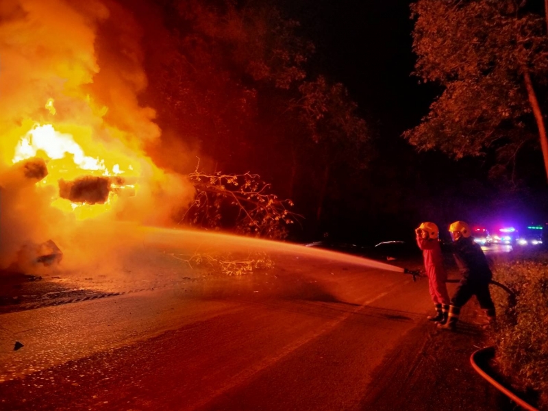 วันนี้(30/5/65) เวลา 00.20 น. ได้รับแจ้งเหตุเพลิงไหม้รถยนต์ที่บริเวณริมถนนสายเอเชีย(ขาขึ้น) ก่อนถึงโรงเรียนบ้านควนขัน เมื่อไปถึงที่เกิดเหตุ พบตัวรถเทลเลอร์ ทะเบียนรถ 71-9426 สงขลา ชนที่กั้นถนนทางโค้ง และพลิกคว่ำ เจ้าหน้าที่ตำรวจจึงต้องปิดถนนชั่วคราวเพื่อความปลอดภัย ในขณะเดียวกันเพลิงได้ลุกไหม้อย่างรุนแรง เจ้าหน้าที่ดับเพลิงเทศบาลตำบลกำแพงเพชร