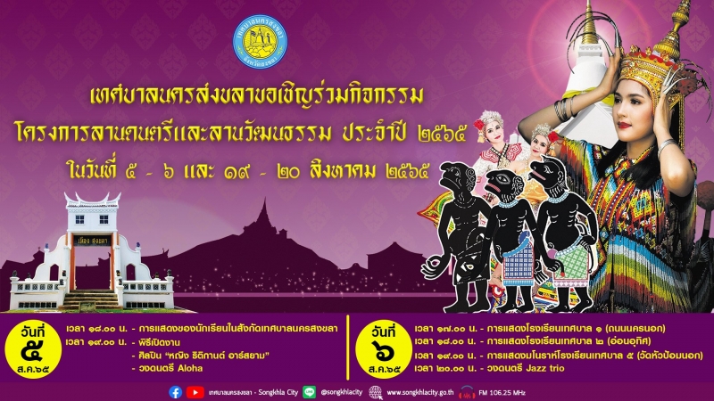 ชมการแสดงดนตรีและศิลปวัฒนธรรมไทย จากนักเรียนในโรงเรียนสังกัดเทศบาลนครสงขลา และการแสดงจากศิลปินต่าง ๆ พิธีเปิดลานดนตรีและลานวัฒนธรรม วันศุกร์ที่ 5 สิงหาคม 2565