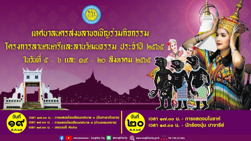 ในวันที่ 5-6, 19-20 สิงหาคม 2565 ตั้งแต่เวลา 17.00 – 22.00 น.ณ ลานวัฒนธรรมเทศบาลนครสงขลา ถ.ชลาทัศน์ อ.เมืองสงขลา จ.สงขลา
