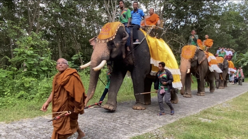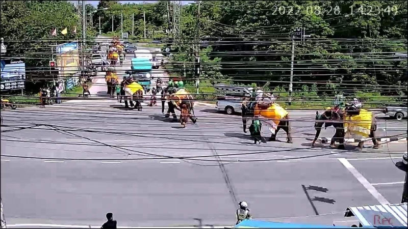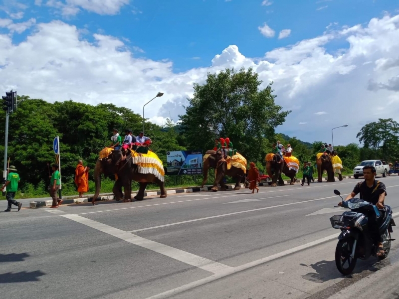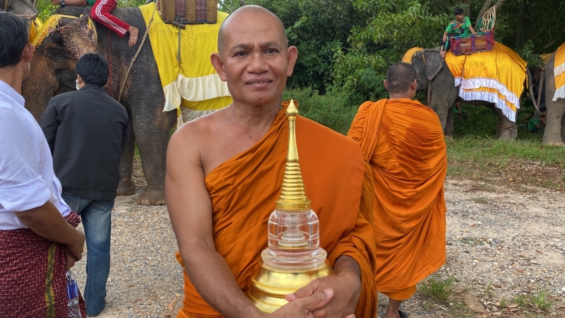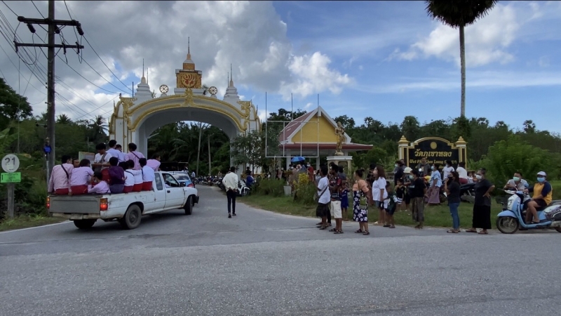 ต่อมาเมื่อถึงเวลา 13.30 น. พระอาจารย์เรวัต ถิรสัทโธ หรือ ท่านเวาะ หรือ โต๊ะกือป๊ะ เจ้าอาวาสวัดเทพนิมิตร พระนฤนัย ถิรสทฺโธ พระลูกวัดภูเขาหลง และ พระอาจารย์ศรีนะ ซินะ พร้อมด้วยชาวมอญนับพันคนร่วมอัญเชิญพระบรมสารีริกธาตุและยอดฉัตร สู่วัดภูเขาหลง ระหว่างทางชาวบ้านที่ทราบข่าวมีการอัญเชิญพระบรมสารีริกธาตุและยอดฉัตร ต่างมารอรับขบวนตลอด 2 ข้างทางเป็นจำนวนมาก พร้อมขอพรจาก พระอาจารย์เรวัต ถิรสัทโธ หรือ ท่านเวาะ หรือ โต๊ะกือป๊ะ เจ้าอาวาสวัดเทพนิมิตร ที่พี่น้องมุสลิมในพื้นที่จังหวัดปัตตานีและนราธิวาส ให้ความเคารพนับถือซึ่งเป็นพระสงฆ์นักพัฒนาและพระปฎิบัติธรรมสายวิปัสนาอย่างถ่องแท้ อีกทั้งยังพูดภาษามาลายูได้คล่องแคล้วและเข้าใจปัญหาที่เกิดขึ้นในพื้นที่สามจังหวัดชายแดนใต้ จึงได้มอบความรัก ความเมตตาและให้การช่วยเหลือพี่น้องมุสลิมด้วยใจบริสุทธิ์ ทำให้ปัจจุบันมีลูกศิษย์เป็นชาวมุสลิมเป็นจำนวนมาก