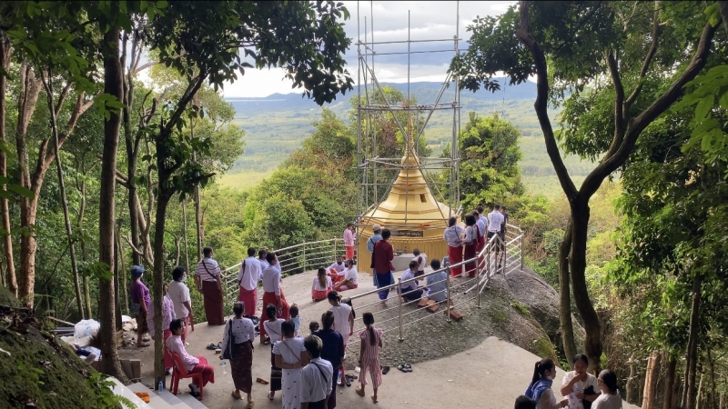 หลังเดินทางมาถึงวัดภูเขาหลง พระนฤนัย ถิรสทฺโธ พระลูกวัดภูเขาหลง ได้พาผู้สื่อข่าวไปดูจุดที่ชาวมอญได้ร่วมกันสร้างองค์พระธาตุอินทร์แขวน หรือ เจดีย์ไจก์ทิโย ตั้งอยู่ก้อนหินขนาดใหญ่ ซึ่งตัวองค์พระธาตุอินทร์แขวน มีสีทองและมีช่องใส่พระบรมสารีริกาธาตุและยังเป็นจุดเช็คอินใหม่ของชาวสงขลาอีกด้วย