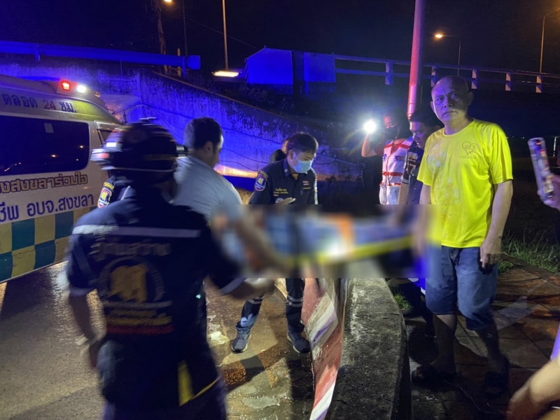 จาการตรวจสอบอาการผู้บาดเจ็บ เป็นชาย อายุ 55 ปี แขนซ้ายท่อนล่างผิดรูป ปวดสะโพกซ้ายรุนแรง ทีมกู้ภัยให้การปฐมพยาบาลรีบนำส่ง รพ.สงขลาเมื่อ 22.01 น.