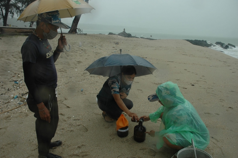 ตรวจวัดปัจจัยคุณภาพน้ำทะเลเบื้องต้น ไม่พบน้ำมันและไขมันลอยบริเวณผิวน้ำที่เก็บตัวอย่าง ค่าความเค็มอยู่ระหว่าง 20-25 ppt ความเป็นกรด-ด่าง 6.5-7.0 ค่าอุณหภูมิน้ำทะเล 26-26.5 องศาเซลเซียส และเก็บตัวอย่างน้ำเพื่อวิเคราะห์ปริมาณปิโตรเลียมไฮโดรคาร์บอนรวมในน้ำทะเล ส่งวิเคราะห์ห้องปฏิบัติการ สำหรับก้อนน้ำมัน (Tar ball) สำนักงานพลังงานจังหวัดสงขลาเป็นหน่วยงานผู้รับผิดชอบเก็บตัวอย่างส่งวิเคราะห์หาองค์ประกอบไฮโดรคาร์บอน