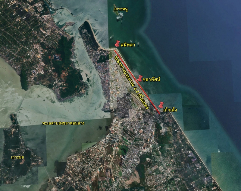 สำรวจพื้นที่พบคราบน้ำมันและก้อนน้ำมัน (Tar ball) ลักษณะเป็นก้อนน้ำมันสีดำเล็กๆ ปะปนกับขยะขึ้นตามแนวลอยคลื่นตลอดแนวชายหาดตั้งแต่หาดเก้าเส้ง หาดชลาทัศน์ และหาดสมิหลา ระยะทาง 4.4 กิโลเมตร