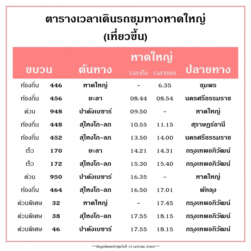 วันนี้(19/1/66) ประกาศขบวนรถให้บริการสถานีรถไฟชุมทางหาดใหญ่ -ประกาศการรถไฟแห่งประเทศไทย การให้บริการรถไฟโดยสารสถานีรถไฟชุมทางหาดใหญ่ ที่มีให้บริการตั้งแต่วันที่ 19 มกราคม 2566