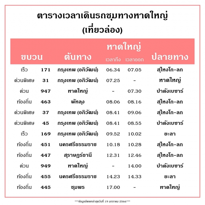 หากมีการประกาศเปลี่ยนแปลง สถานีชุมทางหาดใหญ่จะรีบแจ้งให้ทราบสอบถามเพิ่มเติมติดต่อ ห้องประชาสัมพันธ์ 074-261290