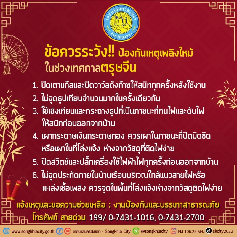 พร้อมทั้งทางเทศบาลสงขลา ได้แจ้งข้อควรระวังป้องกันเหตุเพลิงไหม้ ในช่วงเทศกาลตรุษจีน เทศกาลตรุษจีน มักมีการประกอบอาหาร จุดธูปเทียนบูชาเทพเจ้า และไหว้บรรพบุรุษ การเผากระดาษเงินกระดาษทองและการจุดประทัด จึงเพิ่มความเสี่ยงต่อการเกิดเพลิงไหม้ เพื่อความปลอดภัยควรปฎิบัติเพื่อป้องกันเพลิงไหม้ ดังนี้