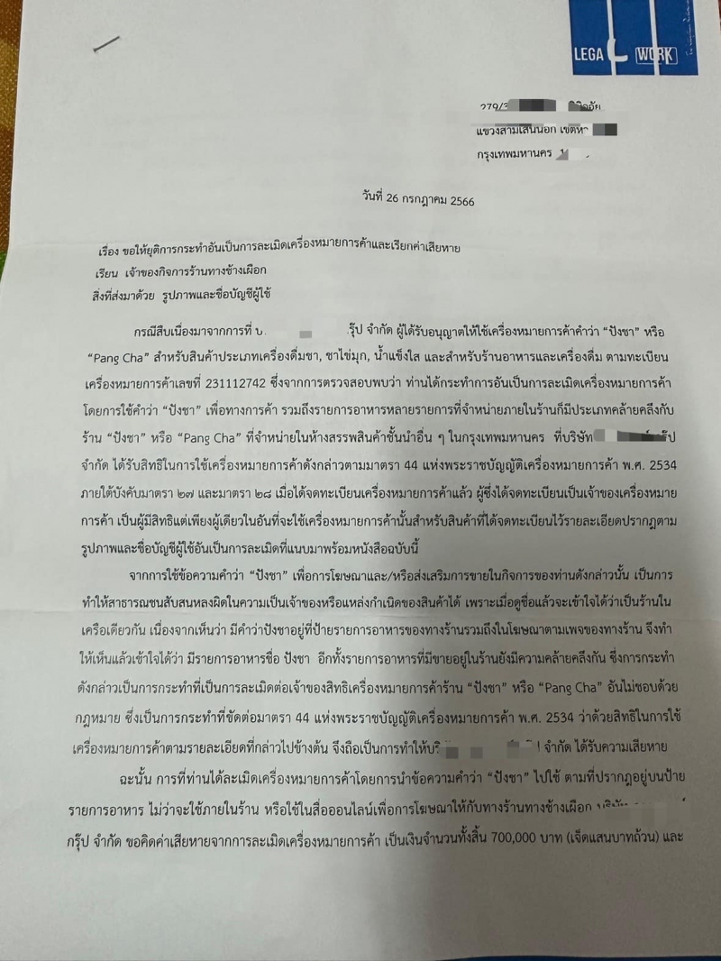 วันนี้(30/8/66) จากกรณีข่าวปังชาฟ้องร้านนมสดทางช้างเผือก หาดใหญ่ โดยมีคำว่าปังชาอยู่ในป้ายกล่องไฟ เขาแจ้งมาว่าการกระทำนี้ทำให้บริษัทดังได้รับความเสียหาย จึงคิดค่าเสียหายมาเป็นเงินจำนวน 700,000 บาท ภายใน 7 วัน ถ้ายังเพิกเฉย คิดเพิ่มวันละ 10,000 บาท