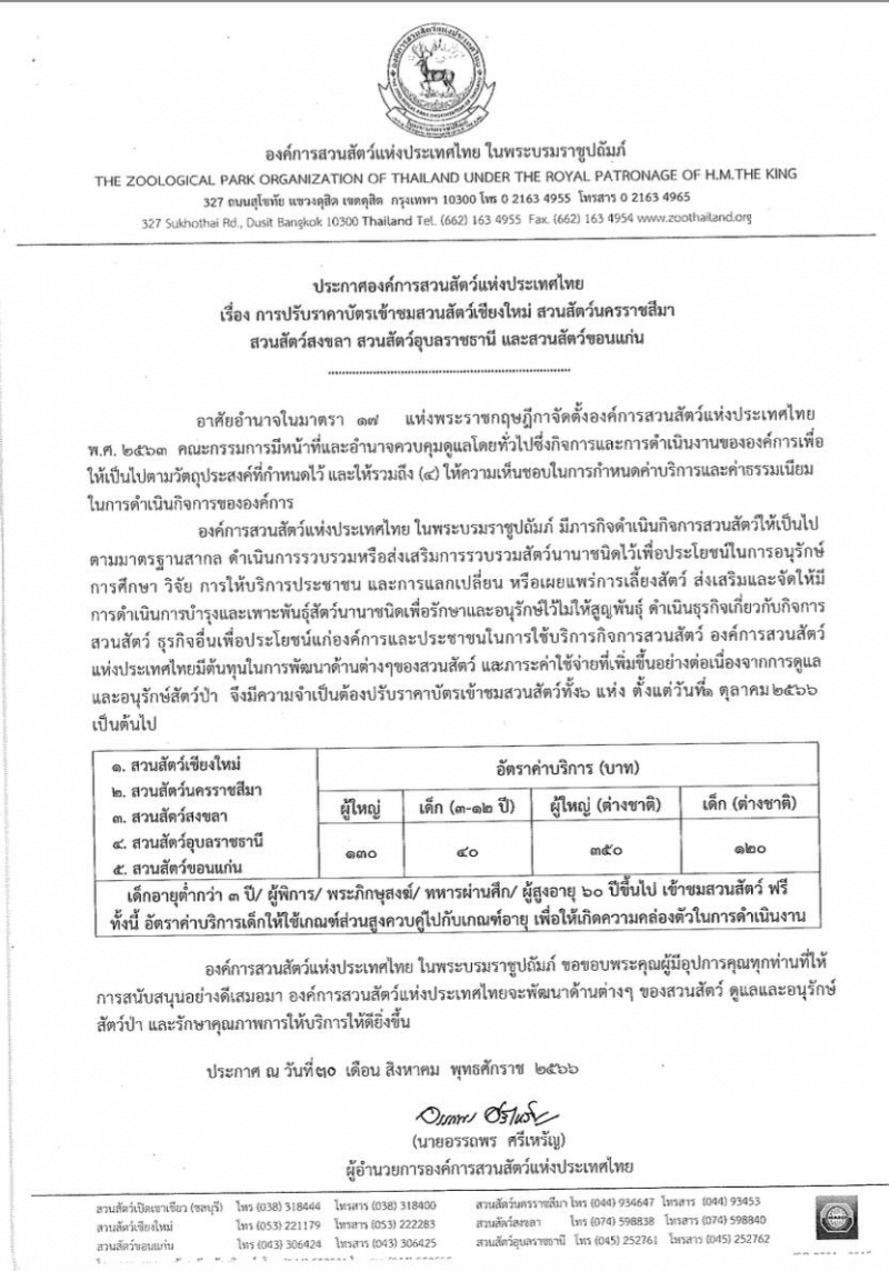 ลงวันที่ 30 สิงหาคม 2566 มีผลตั้งแต่วันที่ 1 ตุลาคม 2566 เป็นต้นไป จึงขอประกาศให้ประชาชนทุกท่าน ตลอดจนผู้ที่ติดตามเพจสวนสัตว์สงขลาให้ทราบโดยทั่วกันไว้ ณ โอกาสนี้ครับ