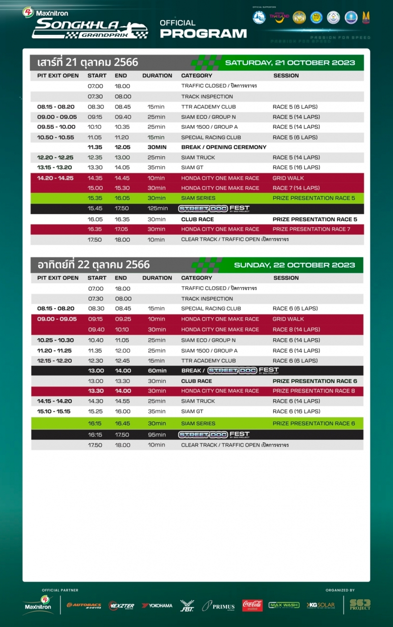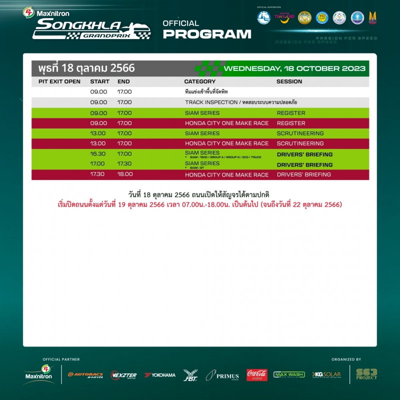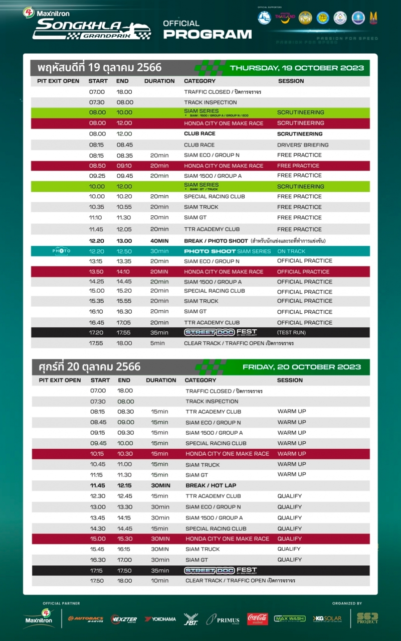 “OFFICIAL PROGRAM TIMETABLE"ตารางการแข่งขันรถยนต์ทางเรียบในรายการ PT SONGKHLA GRAND PRIX I FINAL ROUND ณ สนามพีที สงขลา กรังด์ปรีซ์ จ.สงขลา ในวันที่ 18-22 ตุลาคม 2566