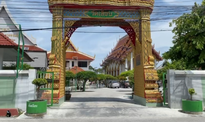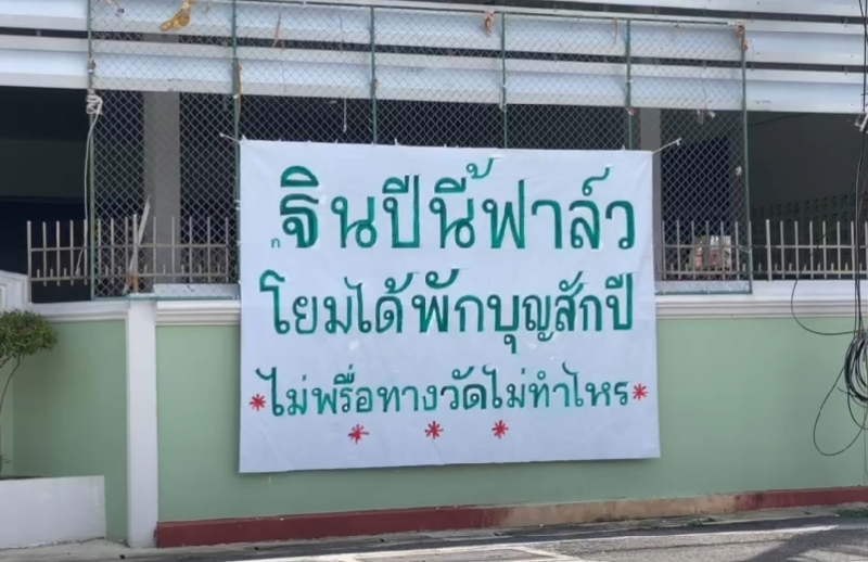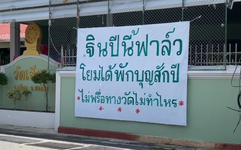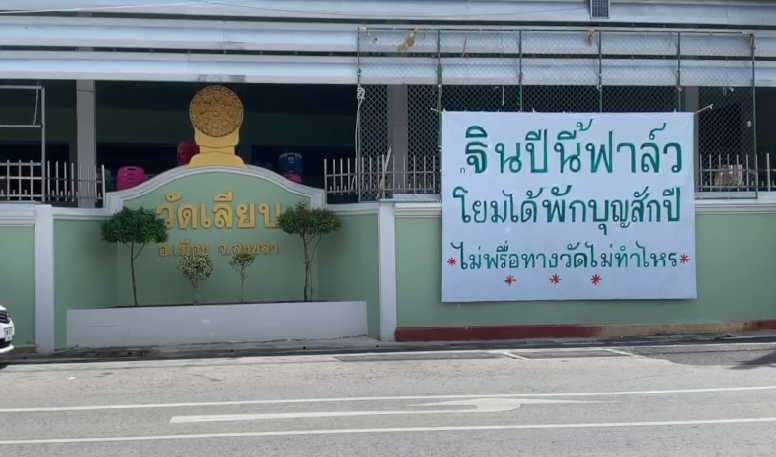 ล่าสุดผู้สื่อข่าวได้เดินทางลงพื้นที่ตรวจสอบพบ บริเวณข้างกำแพงวัดเลียบ ตำบลบ่อยาง อำเภอเมือง จังหวัดสงขลา พบป้ายขนาดใหญ่กว้าง 2 เมตร ยาว 2 เมตร มีข้อความระบุว่า "ฐินปีนี้ฟาล์วโยมได้พักบุญสักปี ไม่พรึ่อทางวัดไม่ทำไหร" ส่วนอีกป้ายระบุข้อความว่า "ออกษาแล้วสมภารวัดเลียบทอดฐิน 49 วัด โยมทุกคนร่วมบุญได้ วัดละ 2 บาท พอนะโยม" จากนั้นผู้สื่อข่าวจึงได้เดินเข้าไปในวัดเลียบ ซึ่งพบว่าวัดดังกล่าวมีเนื้อที่ 4 ไร่ 3 งาน และก่อสร้างวัดนี้มาตั้งแต่ พ.ศ.2320 ก่อนที่ผู้สื่อข่าวได้พบกับ พระครูนพกิจ โกศล เจ้าอาวาสวัดเลียบ ลำดับที่ 10 ก่อนจะสอบถามที่มาที่ไปของป้ายผ้าดังกล่าว