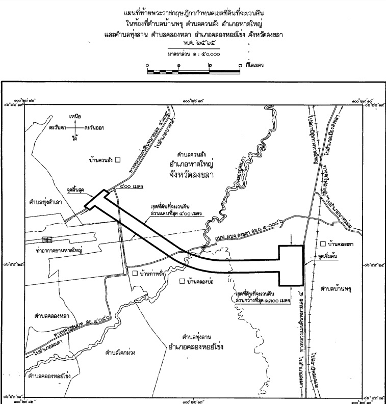 ทั้งนี้ มีพระราชกฤษฎีกากำหนดเขตที่ดินที่จะเวนคืนในท้องที่ ต.บ้านพรุ ต.ควนลัง อ.หาดใหญ่ และ ต.ทุ่งลาน ต.คลองหลา อ.คลองหอยโข่ง จ.สงขลา คณะรัฐมนตรีมีมติอนุมัติหลักการตั้งแต่วันที่ 18 พฤษภาคม 2564 และลงปรระกาศในราชกิจานุเบกษา วันที่ 24 พฤษภาคม 2565 มีทรัพย์สินที่ต้องจัดกรรมสิทธิ์ที่ดินประกอบด้วย ที่ดินประมาณ 447 แปลง สิ่งปลูกสร้างประมาณ 328 ราย และต้นไม้ยืนต้นประมาณ 204 ราย รวมค่าทดแทนในการเวนคืน เป็นเงินประมาณ 1,744 ล้านบาท แต่จนถึงปัจจุบันชาวบ้านส่วนใหญ่ยังไม่ได้รับรับเงินค่าเวนคืนแต่อย่างใด