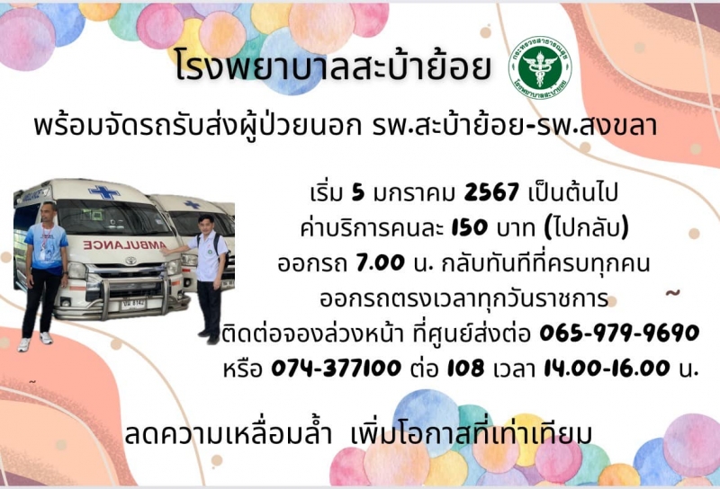 วันนี้(4/1/67) รถตู้ลดเหลื่อมล้ำ พร้อมเดินรถแล้ว!! จะเริ่มในวันที่ 5 มกราคม 2567 โรงพยาบาลสะบ้าย้อยเริ่มเดินรถตู้โรงพยาบาลเพื่อรับส่งผู้ป่วยนอกมาตรวจ หรือติดตามการรักษาที่โรงพยาบาลสงขลาจริงๆแล้วนะครับ เพื่อลดการ loss follow up เพิ่มโอกาสของคนอำเภอไกลโพ้นอย่างสะบ้าย้อยในการเข้าถึงบริการการแพทย์เฉพาะทาง