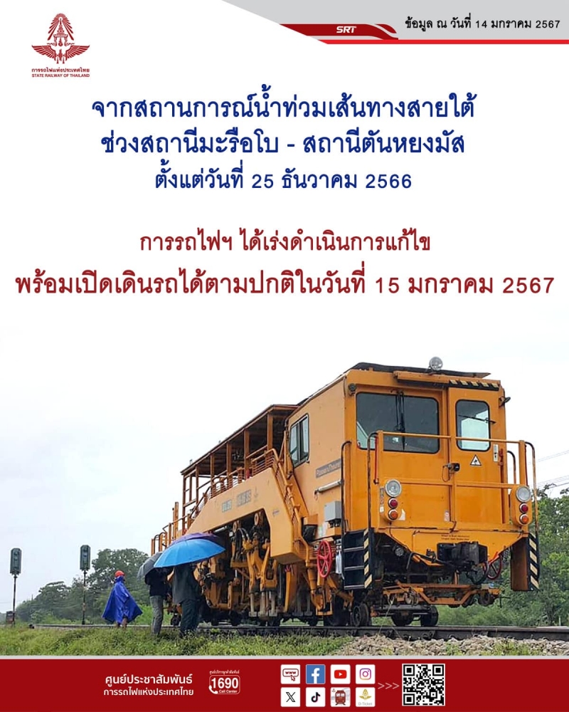 รวมทั้ง มาตรการเฝ้าระวังรับมือกับสถานการณ์น้ำท่วมในพื้นที่เสี่ยง และหมั่นตรวจสอบเส้นทางรถไฟตลอดเวลา เพื่อให้สามารถแก้ไขสถานการณ์ได้ทันท่วงที พร้อมกับจัดเตรียมกำลังเจ้าหน้าที่คอยอำนวยความสะดวก ดูแลความปลอดภัยสูงสุดแก่ผู้โดยสารตลอดการเดินทาง ติดต่อสอบถามข้อมูลเพิ่มเติมได้ที่ ศูนย์บริการลูกค้าสัมพันธ์ การรถไฟแห่งประเทศไทย โทร 1690 หรือ เฟซบุ๊ก แฟนเพจ ทีมพีอาร์การรถไฟแห่งประเทศไทย ตลอด 24 ชั่วโมง.