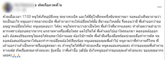 พี่เค้ามีเครื่องมือพร้อมช่วยเหลือทำการตัด จนถอดล้อสแปร์ออกมาได้และทำการเปลี่ยนล้อให้เรียบร้อย หนูเลยขอบคุณพี่เค้าไป หนูถามว่าพี่ทำงานที่ไหน พี่เค้าบอกว่าเค้าเป็นทหารเรืออยู่สงขลา ค่ะ ถ้าหนูไม่ได้พี่เค้าช่วยเหลือ หนูคงแย่แน่ๆเลยค่ะ ฝากขอบคุณพี่เค้าผ่านทางเฟส ทัพเรือสงขลาด้วยนะคะ รู้แค่ชื่อ ว่าพี่เค้าชื่อ วุฒิชัย ยังไงหนูขอฝากขอบคุณเค้าด้วยนะคะ ขอบคุณมากๆเลยค่ะ