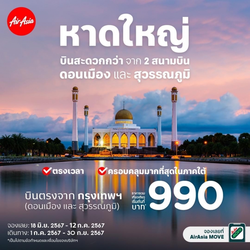 พร้อมชูจุดเด่นเที่ยวบินตรงเวลา เเละมีเครือข่ายบินภาคใต้มากที่สุด มั่นใจได้ทุกการเดินทางทั้งนี้แอร์เอเชียได้จัดโปรโมชั่นฉลองบินสะดวกหาดใหญ่ สู่ 2 สนามบิน ราคาตั๋วเครื่องบินรวม เที่ยวเดียว 990 บาท สำรองที่นั่งได้ตั้งเเต่ 18 มิถุนายน-12 กรกฎาคม 2567 เดินทางได้ตั้งเเต่ 1 กรกฎาคม-30 กันยายน 2567 จองเลยที่ AirAsia MOVE