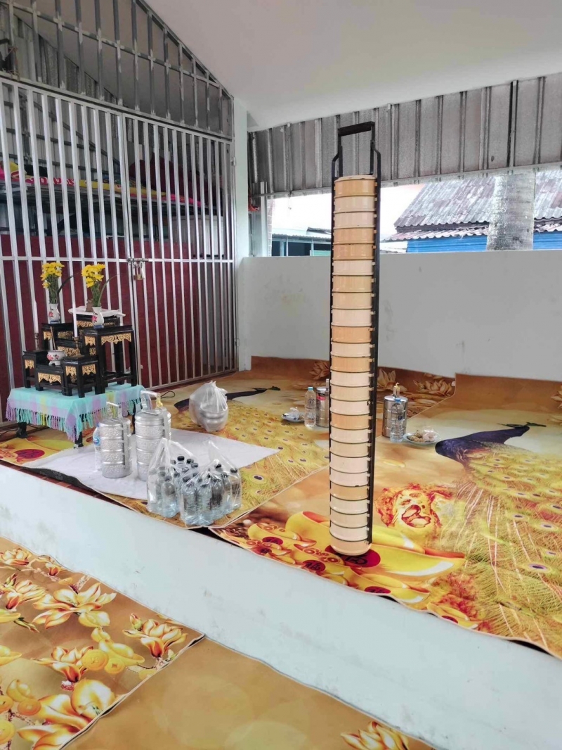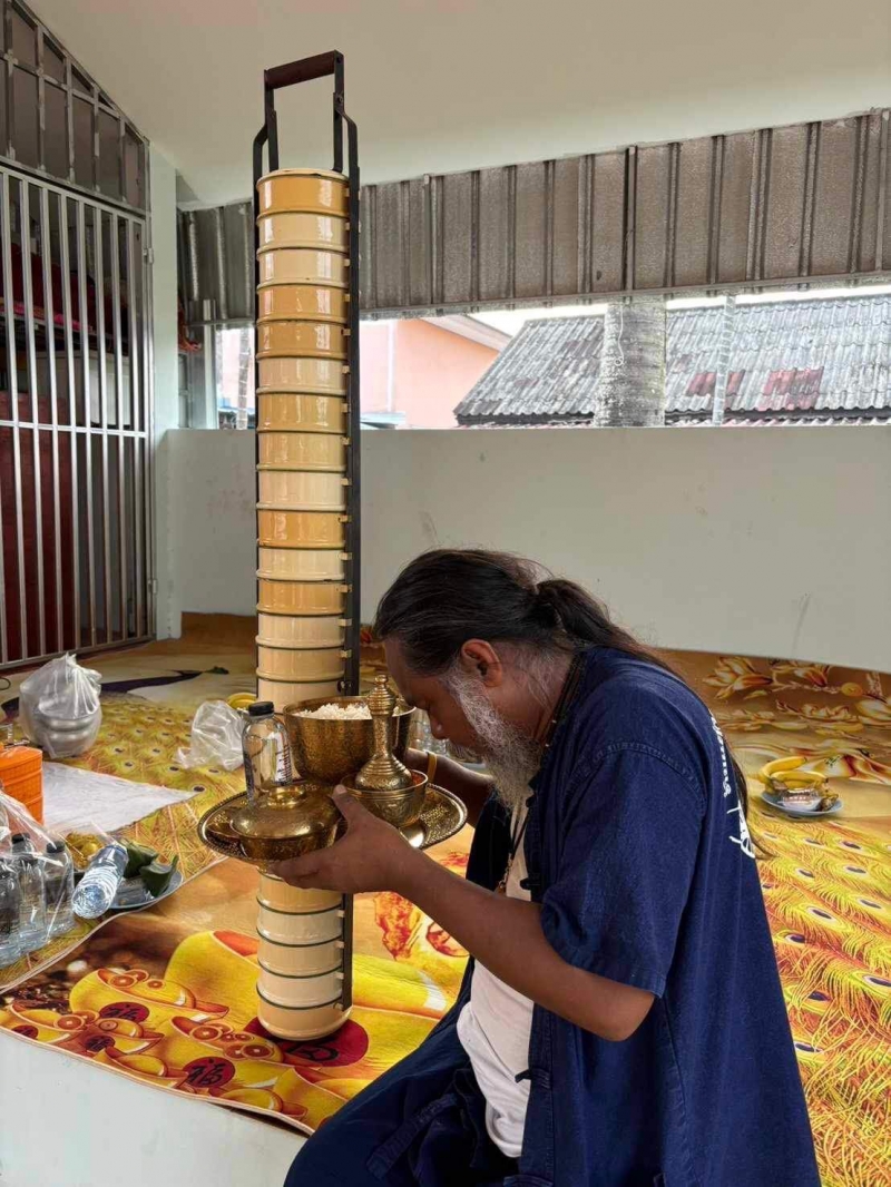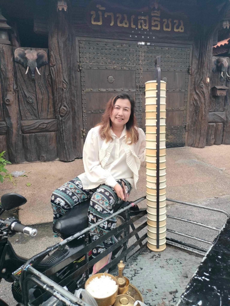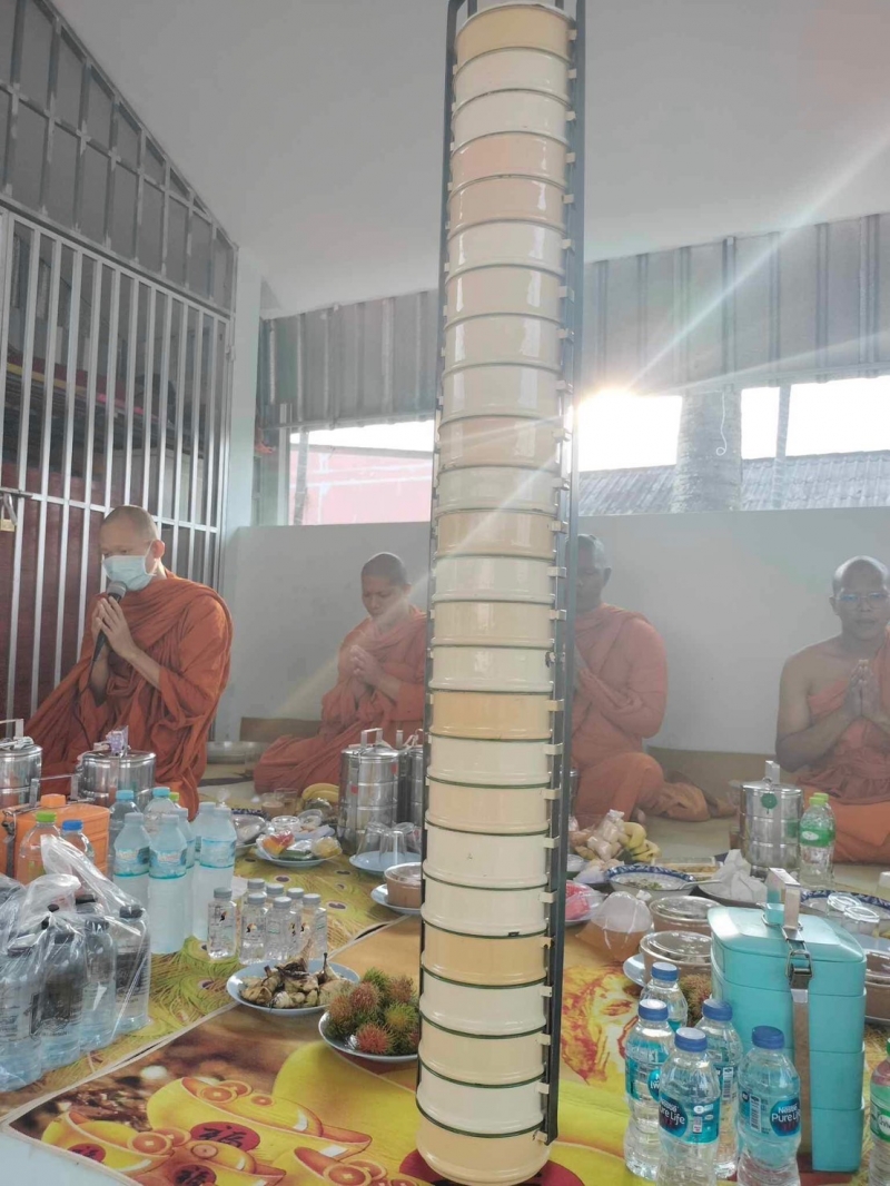 ถ้าใส่อาหารก็ใส่ได้หลายชั้นถ้าหากชาวบ้านไม่มาตนเอาปิ่นโตไปสายเดียวพระก็อิ่มทั้ง 4-5 รูปเลยจะได้ไม่ต้องพึ่งชาวบ้านคนอื่นแล้ว เมื่อเช้าจะเอาปิ่นโตไปกับรถกระบะก็ไม่ได้ รถยนต์เก๋งก็ไม่ได้ ก็เลยเอารถซาเล้งไปแล้วก็ให้ภรรยาเป็นคนจับ แล้วก็งานแรกเลยได้นำปิ่นโตไป 1 เถา มี 25 ชั้น ไปร่วมทำบุญหมู่บ้านประจำปีซึ่งตรงกับวันเข้าพรรษาพอดี