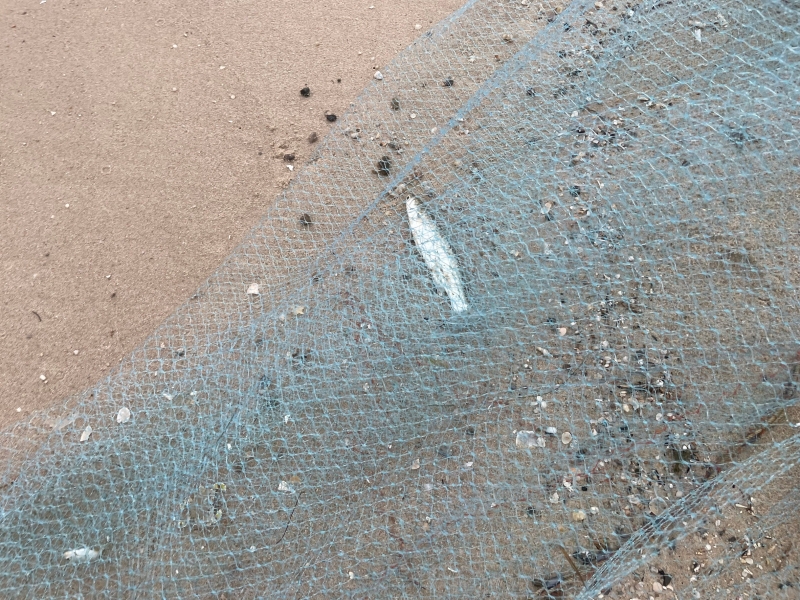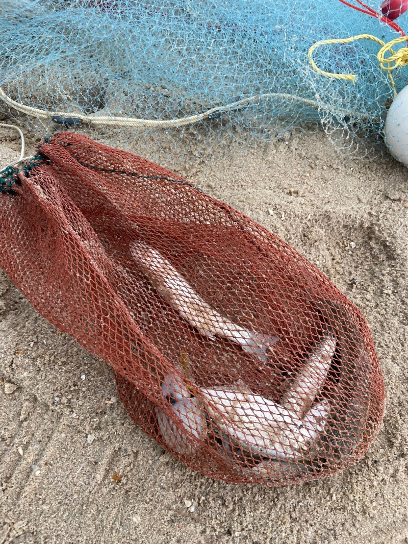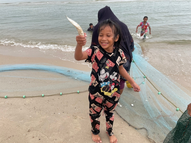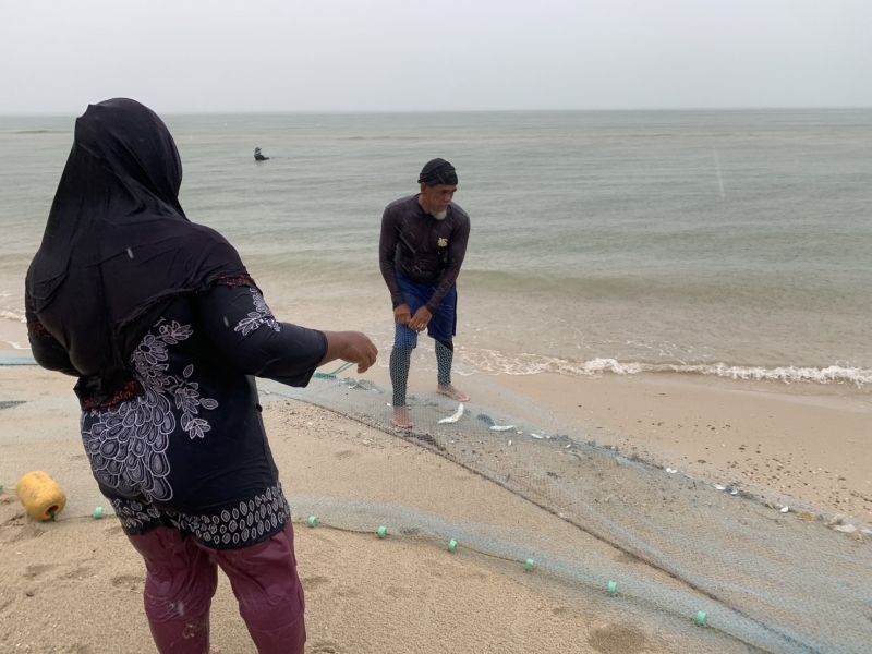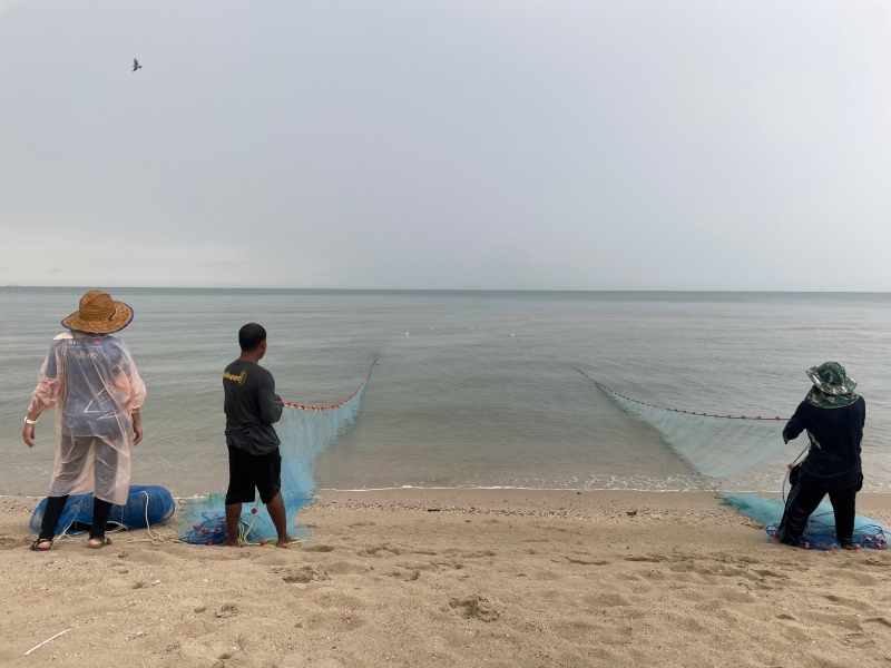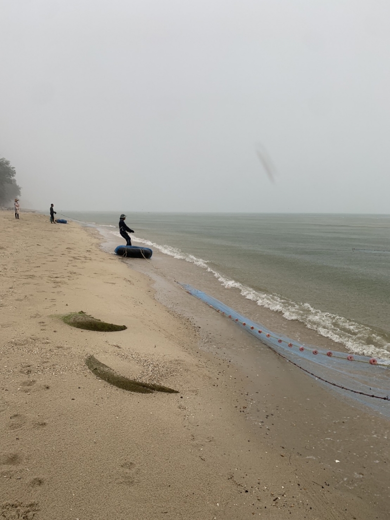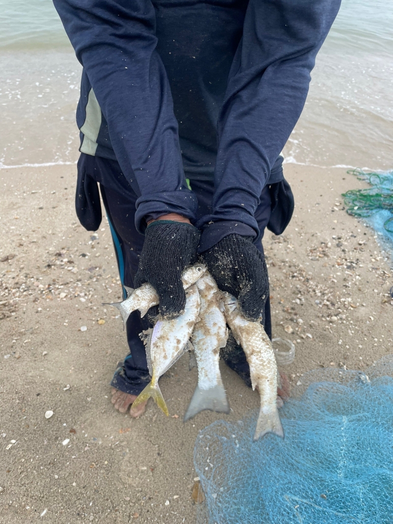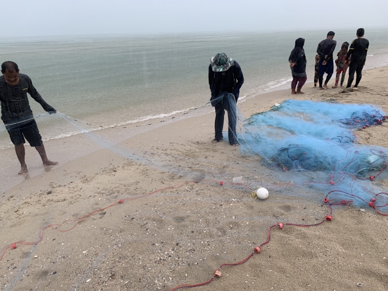 เราจึงได้เฝ้าสังเกตการณ์อยู่อย่างต่อเนื่อง ได้พูดคุยกับบังกี ชาวประงพื้นที่บ้านในพื้นที่ดังกล่าว บังกีเล่าให้เราฟังว่า จริงๆ วันนี้คิดว่าน่าจะได้เยอะแต่ฝนดันตกลงมาซะก่อน ถือว่ายังโชคดีที่คลื่นนิ่งไม่แรงทำให้เราสามารถลากอวนได้ ช่วงเวลาดังกล่าวน้ำลดบังสามารถเดินแล้วนำอวนไปวางได้อีก และจะค่อยๆดึงกลับมาเรื่อยๆ จนมาถึงชายฝั่งปลาก็จะติดมากับอวนที่เราลาก