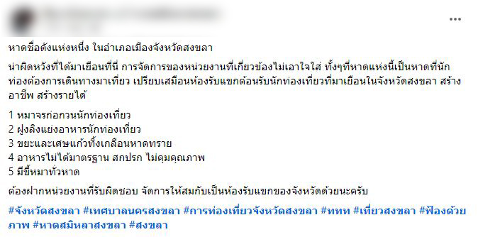 ซึ่งเนื้อหาในโพสมีอยู่ว่า หาดชื่อดังแห่งหนึ่ง ในอำเภอเมืองจังหวัดสงขลา น่าผิดหวังที่ได้มาเยือนที่นี่ การจัดการของหน่วยงานที่เกี่ยวข้องไม่เอาใจใส่ ทั้งๆที่หาดแห่งนี้เป็นหาดที่นักท่องต้องการเดินทางมาเที่ยว เปรียบเสมือนห้องรับแขกต้อนรับนักท่องเที่ยวที่มาเยือนในจังหวัดสงขลา สร้างอาชีพ สร้างรายได้